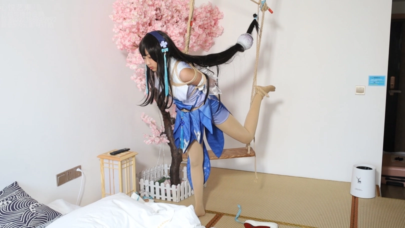 西施妹子被日式小高手紧缚,片足缚吊在秋千的粗绳上面。小脚丫动来动去的好可爱啊。
