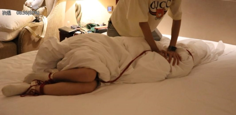 场景3:lolita肉丝棉被包裹挣扎,同样用绳子缠绕,双手隔着棉被闷捂限制呼吸。