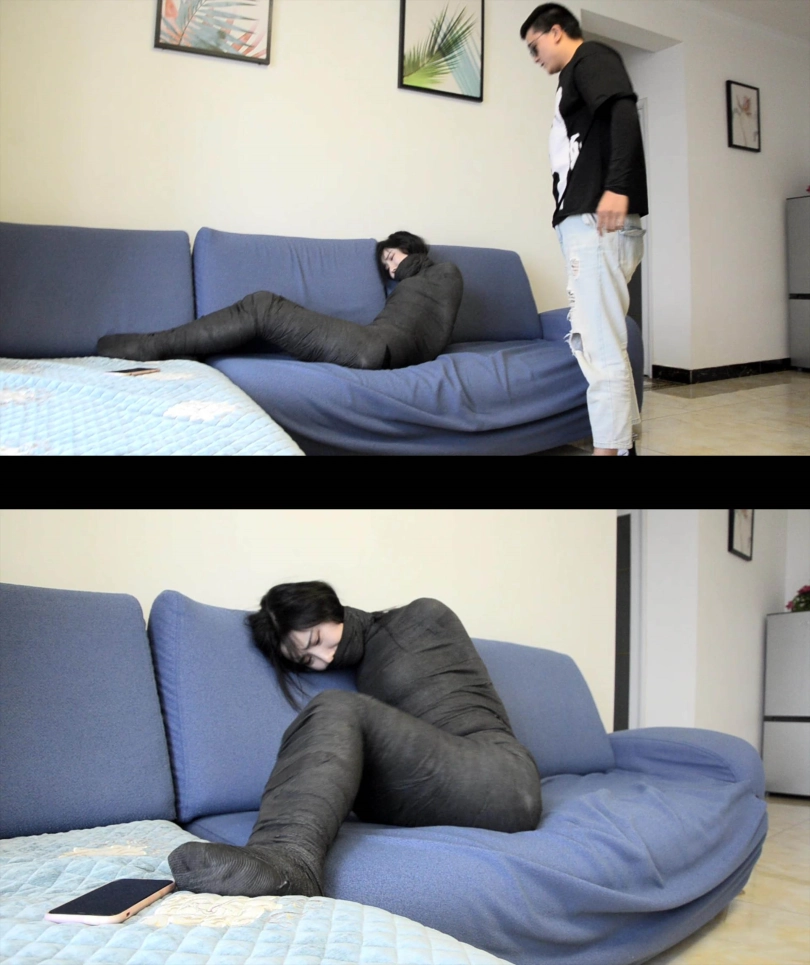 黑丝美女收到一份诡异的快递,里面是个黑丝胶带,美女有点怀疑的收下了,但没想到睡觉时突然被胶带包裹,美女奋力挣扎但却约挣扎缠绕的越多,最后被包裹成了一个蠕动的木乃伊段子。
