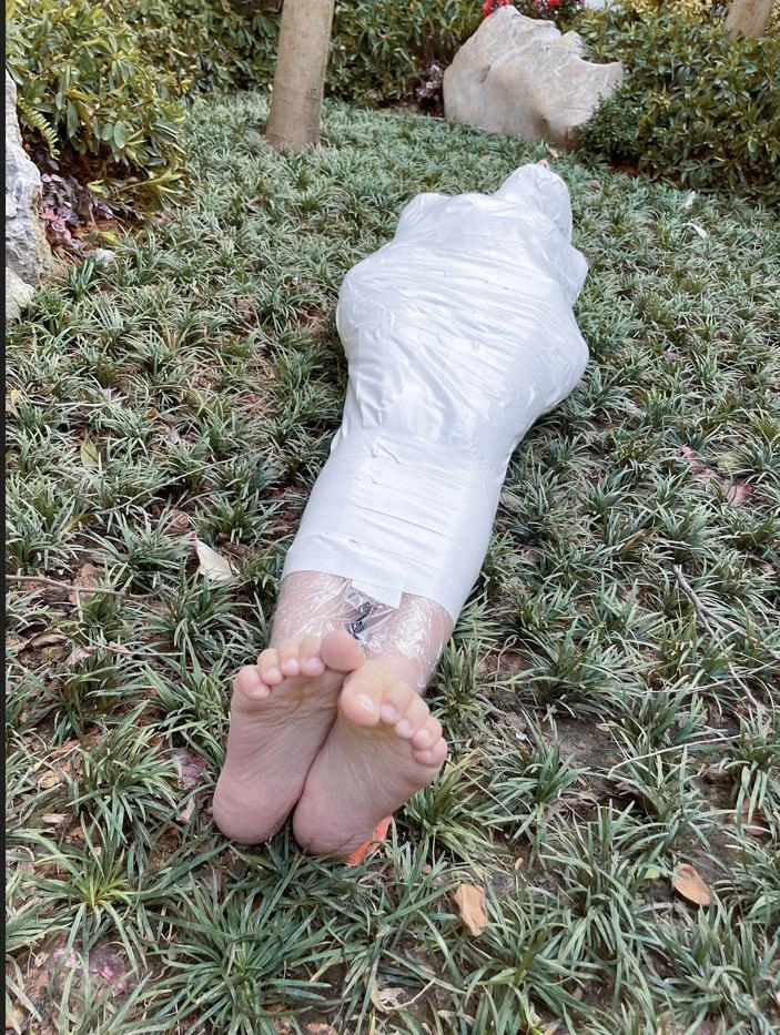 包好之后放置在位于湿地公园内一间别墅院落的草地里,只露出一对嫩脚心。夏天的草坪蚊虫超级多,茶茶白嫩的玉足就这么白生生的暴露在空气中,成为蚊虫们唯一的目标。挠一挠摸一摸,茶茶恐惧极了。