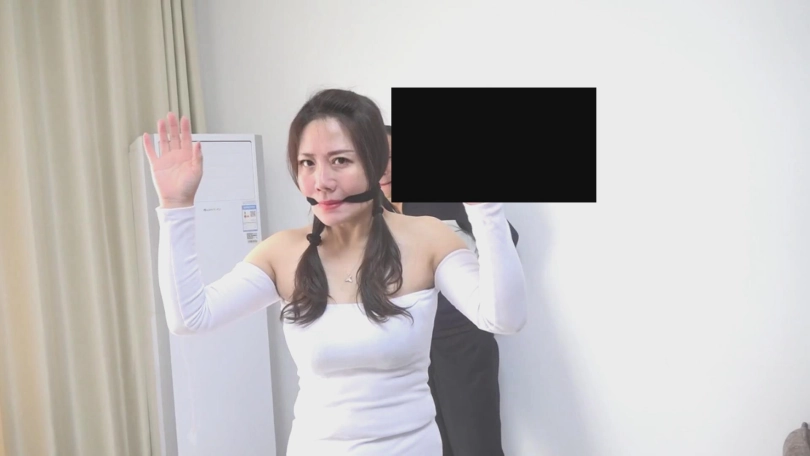 林静被丝袜勒嘴,王老板则被毛巾塞嘴。林静和王老板苦苦挣扎,接着绑匪过来,将两人的塞口物互换。把王老板塞嘴的毛巾塞到了林静的嘴里,又将勒过林静嘴巴的湿淋淋的丝袜勒到王老板嘴里。接着拿出一个倒计时的爆弹,按下按钮,两人疯狂地挣扎。挣扎一段时间后,绑匪又出奇招,将两人抱在一起绑上,然后把爆弹塞到了林静露背装的衣服里,之后离开。林静疯狂地挣扎着,终于挣脱了绳索,解锁了炸弹。然后顾不上自己的嘴里还塞着丝袜,嘴外还封着胶带,她先把王老板解开,接着再撕开自己嘴巴上封的胶带以及嘴里塞的肉丝袜。