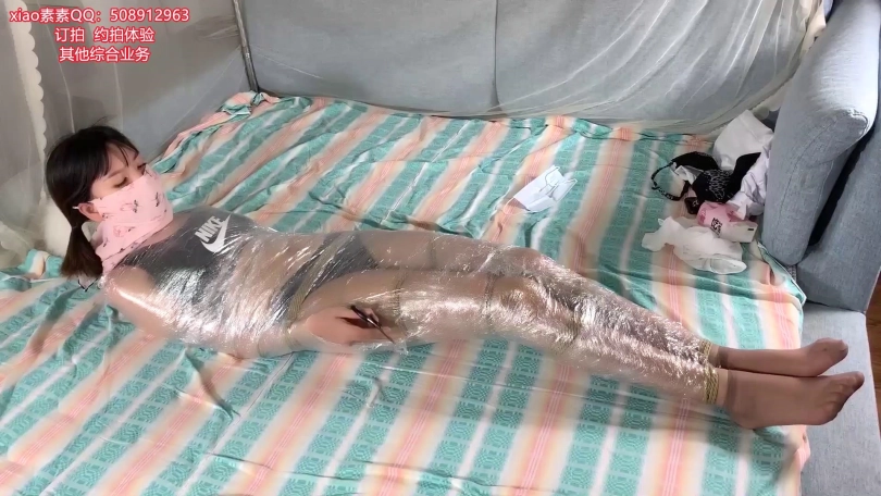 惩罚就是全身捆绑的状态下,保鲜膜包裹全身,这么热的天气,接受这个挑战打心底佩服xiao素素!还是老规矩,必须自行解开要不然还是要接受下一个惩罚!没办法,xiao素素最后在费劲九牛二虎之力后终于完成了这个挑战!