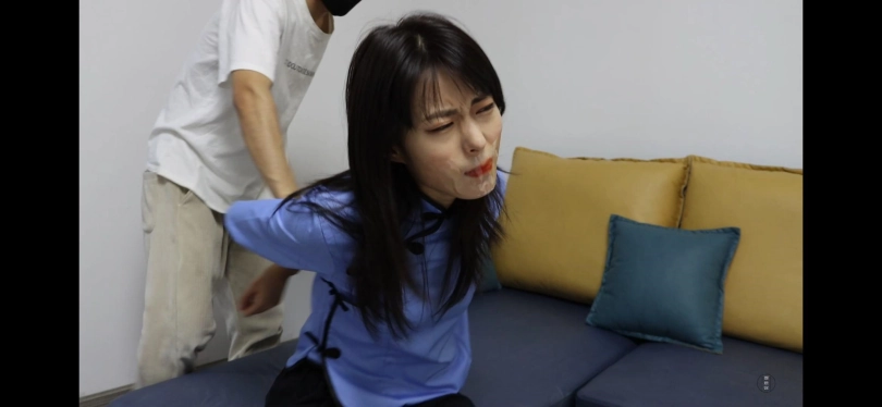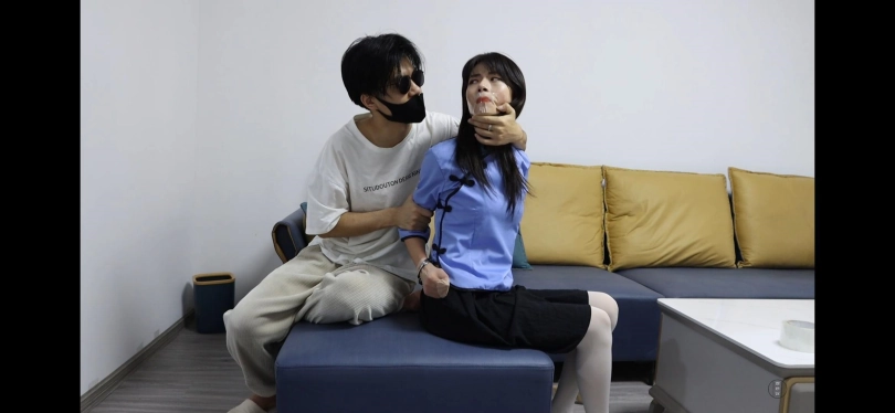 塞入丝袜后,嘴巴被封住,不要露出丝袜。(可以切镜头后塞入小一点的丝袜,嘴巴不要太鼓起来)