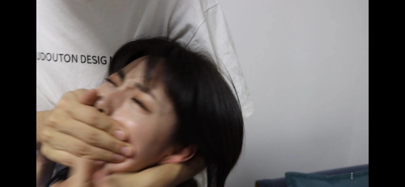南羽被男人从一旁抵住,用胶带给南羽嘴巴封住。(多给特写,嘴巴被封后的褶皱和蠕动)