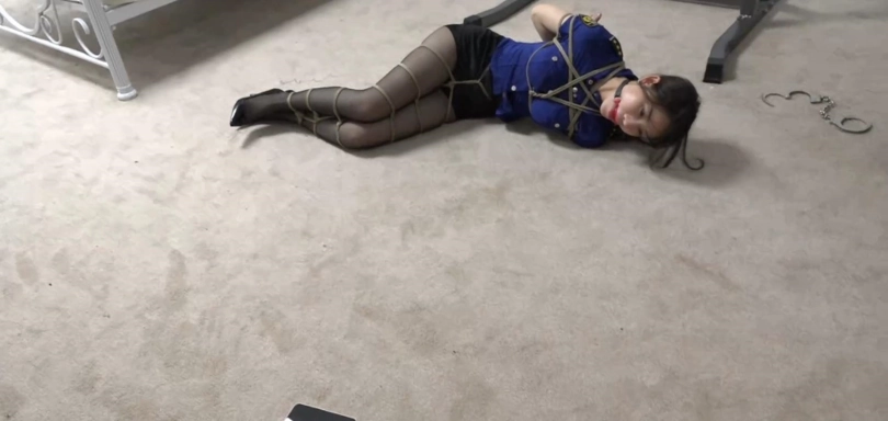 (值得一说的是因为我对于一些捆绑方式的话还是不太懂如何更有美感,如果对于一些捆绑方式有意见的可以留言,毕竟我知道的捆绑方式只有那几种,剧情嘛还是有蛮多的,所以希望大家能提一些宝贵的意见,不然以我对捆绑姿势的认知太少了,视频的话为了让大家都能看到是不会以太高的价格售出的,下面简单说一下剧情背景)刘小萌被紧紧捆绑起来,这个时候匪徒又进来了。匪徒还是不放心对她的捆绑,紧接着又拿来一根绳子为她解开腿上的脚铐。刘小萌戴着口球艰难的说出一句话:“你要干什么,我劝你还是尽快自首吧!”匪徒:“你给我老实点待着,不然我可不能保证你的安全。”解开脚铐之后扶着她站了起来,用着绳子在她的双腿来回缠绕,捆绑好之后刘小萌两条双腿被紧紧捆绑在一起,以至于无法保持平衡差点摔倒,匪徒扶着她继续躺下。其实这个手机我没想到是这样子拍的,细节有点不好。而躺在地上奋力挣扎的刘小萌正在思考着如何解开捆在自己身上的绳子,躺在地上不停的扭动着。被捆的这么紧匪徒也不知道什么时候会回来,该怎么办了?突然她看到自己身边不远处放了一部手机,心中不禁看到一丝希望。现在得抓紧时间移动到手机面前,匪徒也不知道什么时候会回来。看到了希望刘小萌努力蠕动着自己的身体,但是被紧紧捆绑的她尽管此刻手机就在自己身边不远处,却又显得那么遥远,艰难的移动自己的身体,只是每次只能移动那么一点点距离,不一会身体便被汗水湿透。此刻她的心中非常着急,在不快点的话匪徒就要回来了。她开始加快自己移动的速度。终于在她的努力下她成功的移动到了手机旁边,刘小萌心中不免松了口气。不过双手被捆在身后,行动不便还是非常艰难的。又是一番努力过后,成功把手机拿在手里,用着仅能活动的手指发出了一条短信。(大家可以猜猜她把信息发给了谁)看到信息成功发送出去,她悬着的心终于放松下来,还好匪徒没有回来。正当她发送短信过去之后,这时匪徒突然走了进来。看到刘小萌的小动作大怒着说:“被捆成这样了还不老实是吧,看来必须得把你捆得不能动弹你才能老实。”看到回来的匪徒,刘小萌眼中漏出了一丝惊恐~