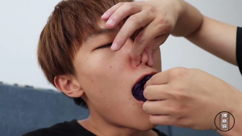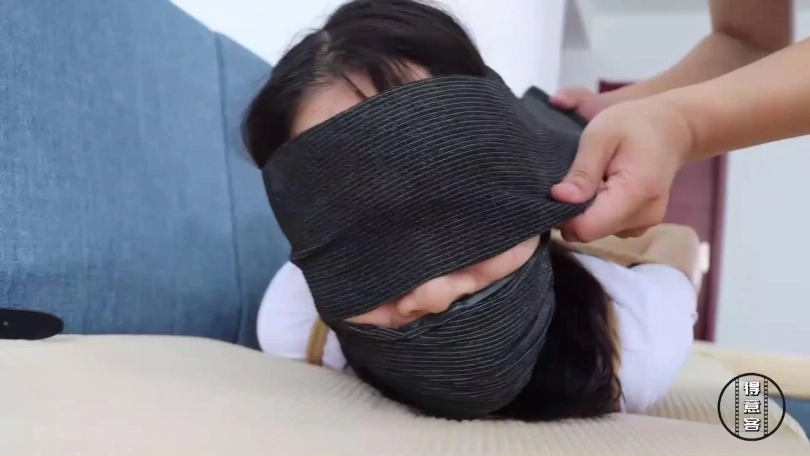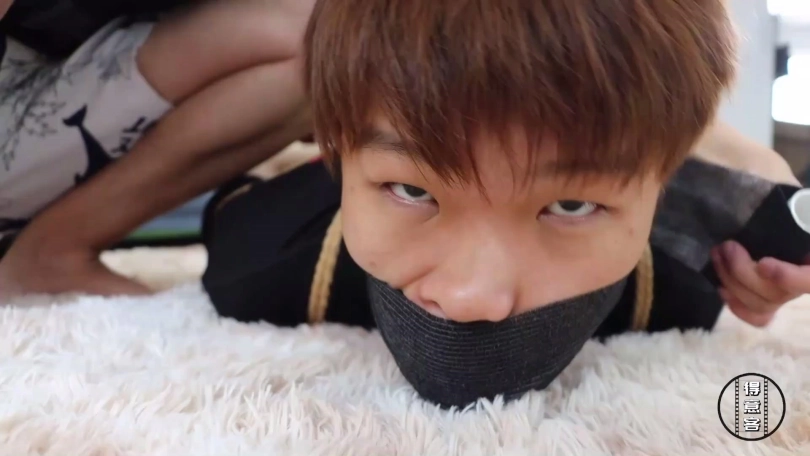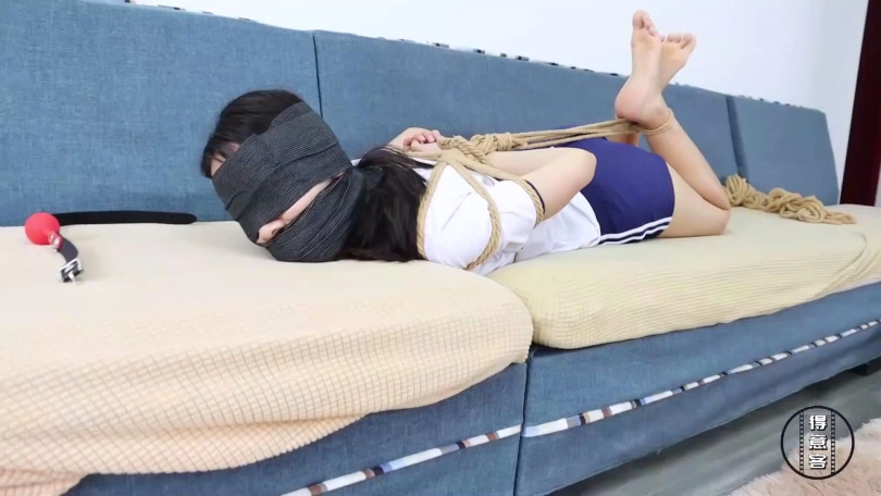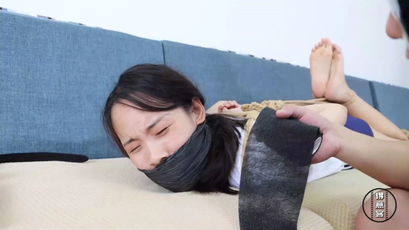 劫匪将倒霉的情侣二人重新捆成五花大绑加驷马姿势,分别将女孩放置在沙发上,将女孩男友放置在沙发一侧的地上,为了进一步羞辱二人,劫匪分别脱下女孩脚上穿的一双白色锦纶丝袜和女孩男友脚上穿的一双蓝色锦纶丝袜,将这两双原味锦纶丝袜交换塞入情侣二人口中,令他们苦不堪言,而后劫匪用黑色宽胶布分别在二人嘴外封5张,再用黑色自粘绷带缠绕5圈封紧。