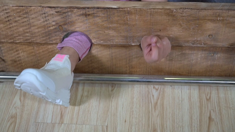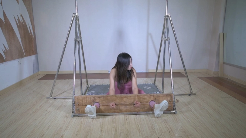木枷与多功能铁架完美结合,就可以创造出无数的惩罚方式,这次让萱萱穿着瑜伽服和运动鞋体验一下TK惩戒,公鸭嗓的萱萱这回真是放开了笑了。