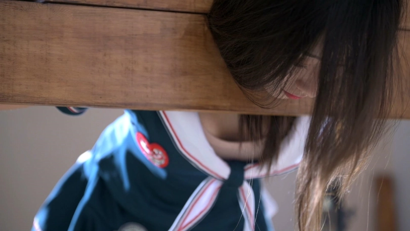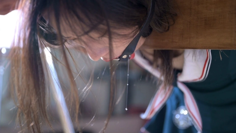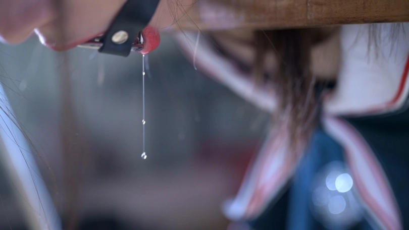 萱萱穿了一件超短裙配上高跟,显得腿还挺修长。这一次她被弯腰九十度固定在木枷上,绳师让她第一次体验了下被打屁股的感觉,然后给她带上了中间是圆形的口撑,口水便不住地流了出来。