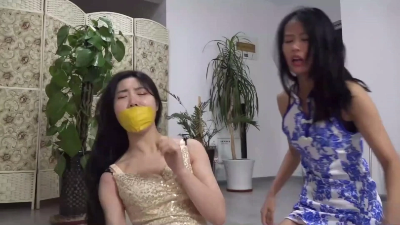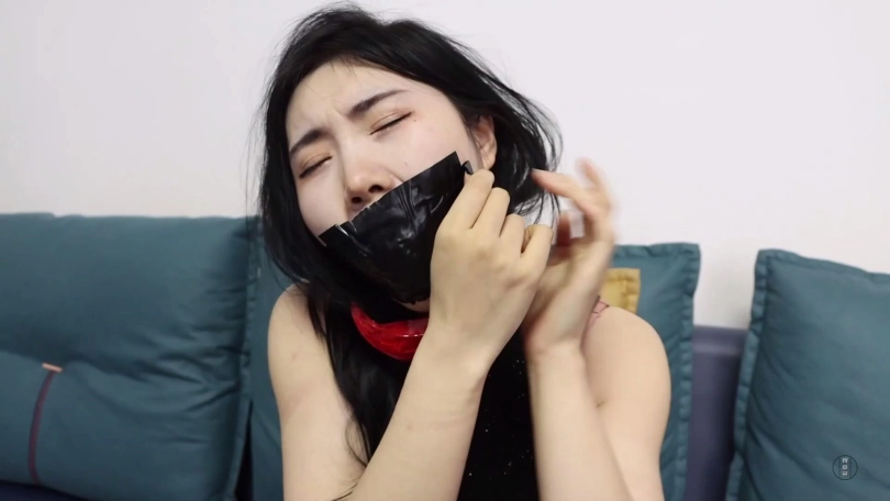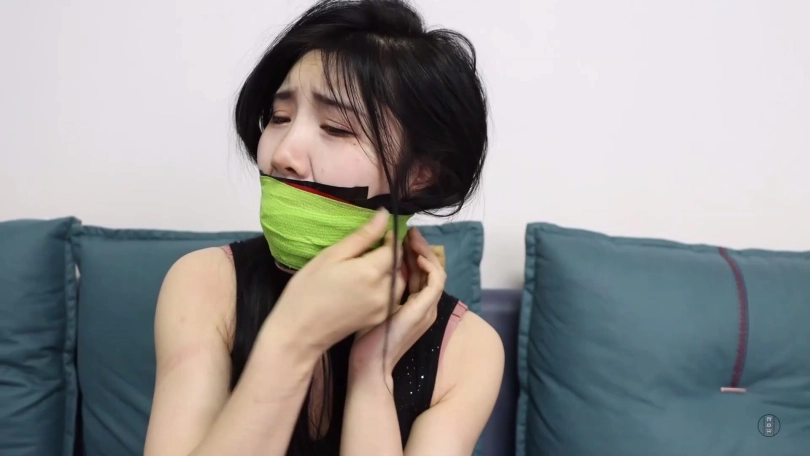 (四)被坏女人李然入室捆堵折磨的美女阿琳和其男友背靠背连缚挣扎多时后终于弄松绳结挣脱,情侣二人赶快撕掉封眼绷带胶带,拽下嘴外绷带胶带宽胶布,分别拽出口中对方的原味臭锦纶丝袜丢掉,大口喘气同时咒骂着李然这个可恶的女反派。