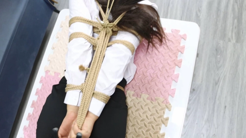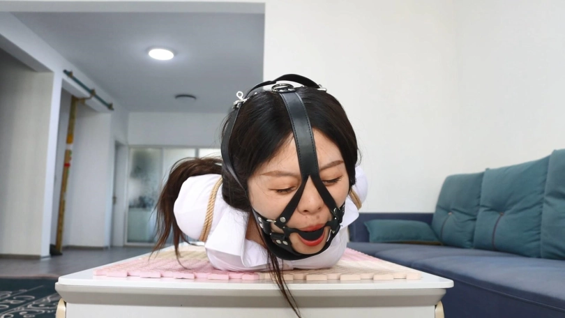 菲尔表面上是公司老板的秘书,实际上是老板的私人绳模。今天菲尔穿着白衬衣包臀裙黑丝高跟鞋,经典OL制服,被老板纸币司马紧缚放置在办公室的茶几上,头上还带着马具口球被强制抬头。老板说出去办点事,让她在这自己玩会,不一会菲儿手脚就捆麻了,被困在茶几上又怕动作太大会摔下去,就只能保持这个姿势不能翻身,口水流了一地。过了很久老板回来了,还带来了一套JK制服,菲儿还会玩到什么游戏,请期待下集。