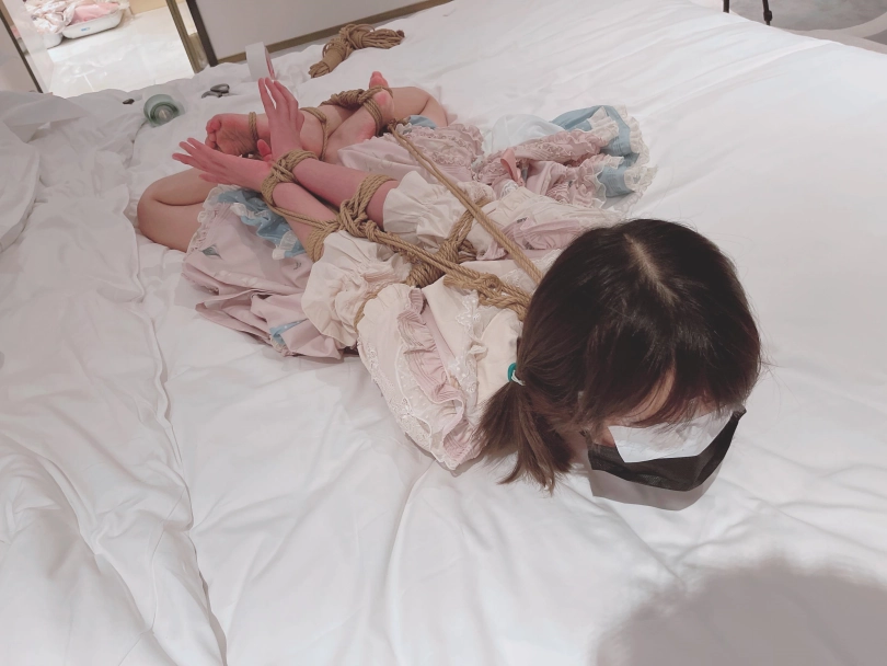 既然是紧缚,手指脚趾又怎么能放过呢?用两根绳子分别做一个折腿缚,再把折叠起来的双腿用盘腿缚的姿势绑起来,最后把脚腕茶茶分别固定在背后直臂的绳子上,然后用绳子把大拇指也捆在一起。为了保证茶茶的小脚丫动弹不得,这次还用绳子分别把两只小脚盘腿固定在另一只小腿上,连脚趾也不放过,同样把大脚趾绑起来和腿固定在另一只脚的脚腕上。