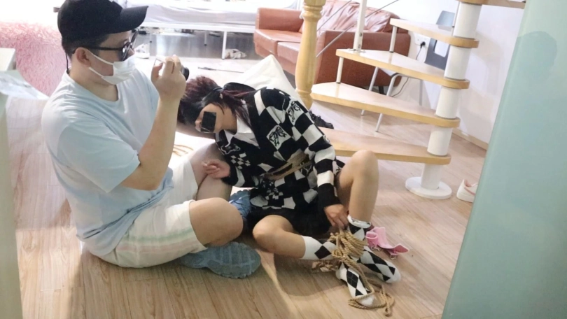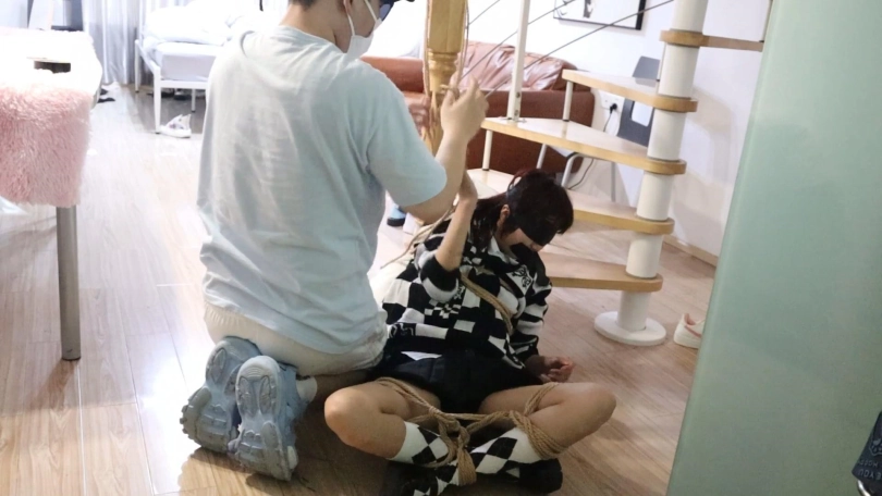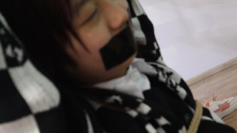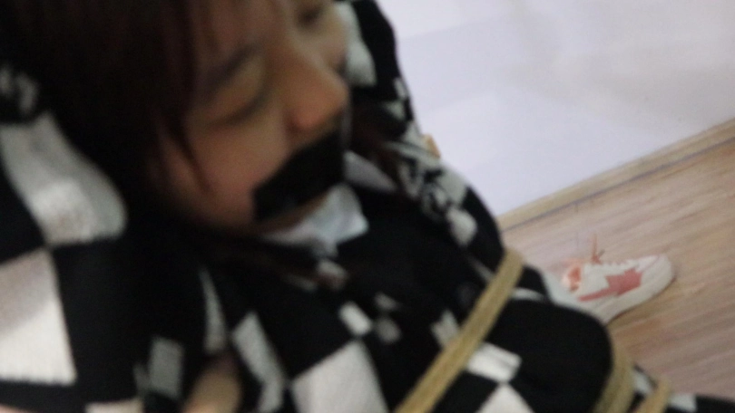 只听到女孩嘴巴被粘上胶带痛苦的呜呜呜声以及想挣扎却被绳索紧紧固定的无助