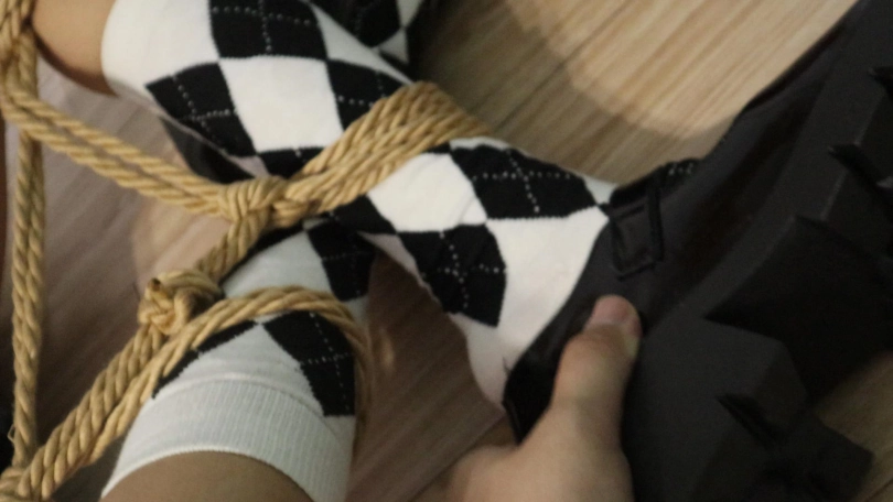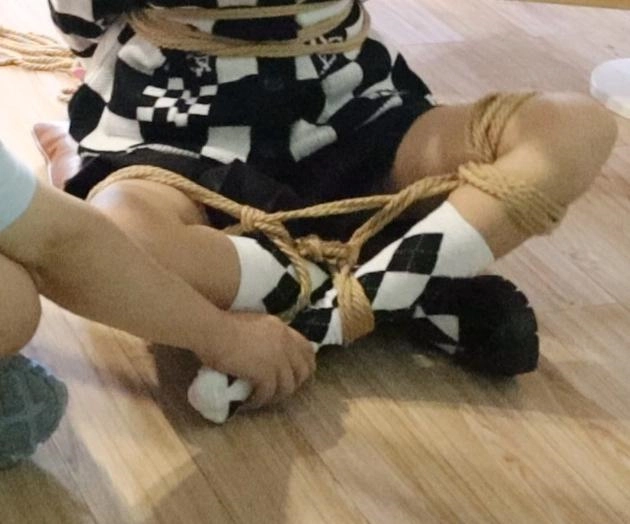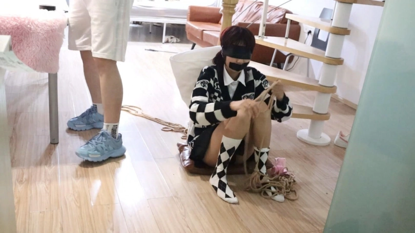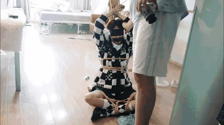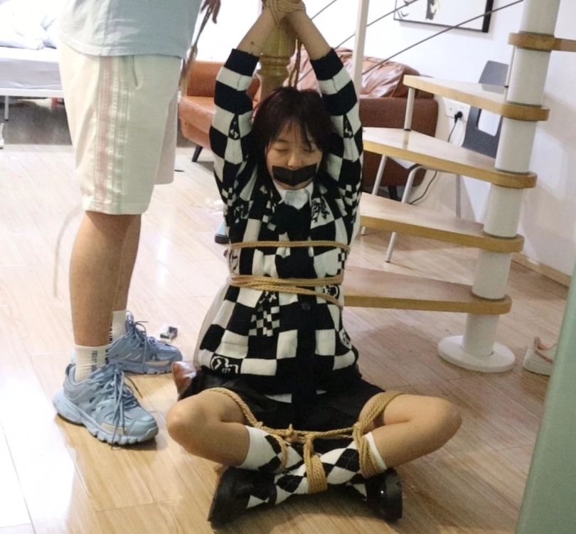 女孩却无能为力,只能拼命挣扎直到盘腿缚的脚都弓起来了