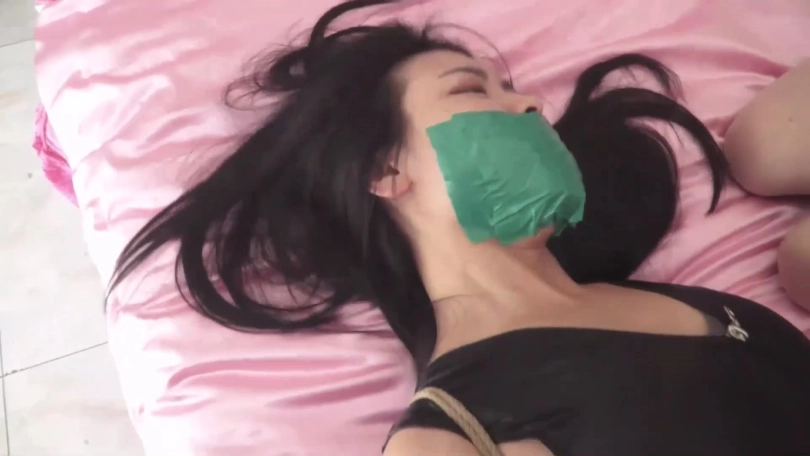 片段3:模特夏炎被一条原味脏肉色连裤丝袜塞满嘴,嘴外并绿色电工胶布封住,并被黑色弹力自粘绷带缠绕封嘴。
