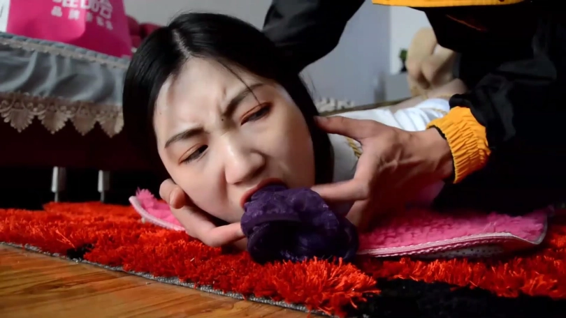 片段4:模特小鱼被一条紫色脏内裤和自己脚上扒掉的两只原味肉色短丝袜塞满嘴,嘴外被银色电工胶布封住,嘴外缠绕黄色静电胶带与紫色自粘绷带。
