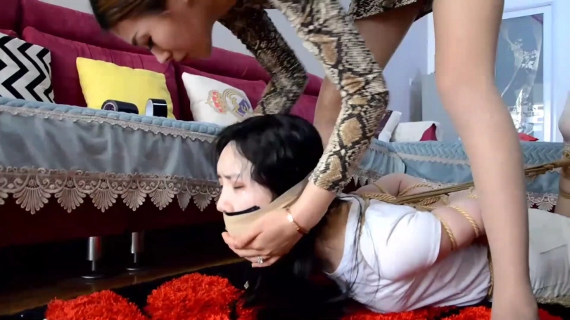 片段1:模特李然和王蕾分别被一双脏肉色连裤丝袜和一双深灰色锦纶丝袜塞满嘴,嘴外被绿色宽电工胶布封住,并用紫色弹力自粘绷带缠绕封严实。