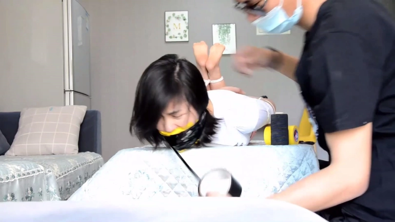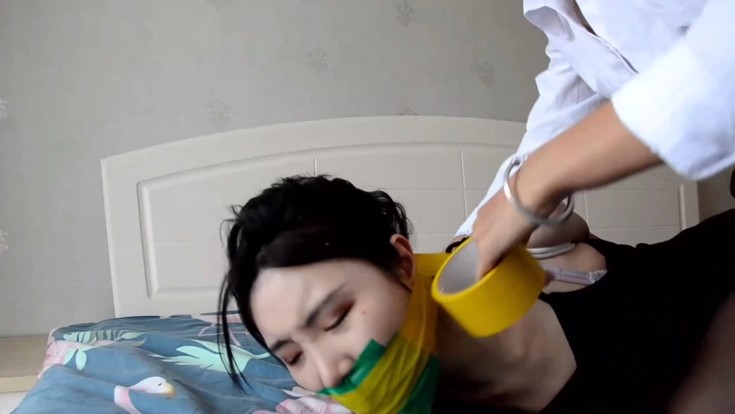 片段9:模特王仟雅被一双原味脏黑色锦纶丝袜塞满嘴,嘴外被紫色电工胶布封住,并被黄色静电胶带与黑色自粘绷带缠绕封嘴。