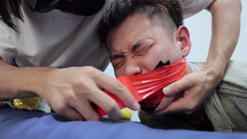 恶趣味的劫匪给床上被驷马的姐弟二人拍照,还故意拿给他们看进行羞辱,姐弟二人愤怒瞪向劫匪,劫匪一看干脆把姐弟俩眼睛给封上,先给琪梦表弟眼睛外用红色静电胶带缠绕4圈,再用黄色弹力自粘绷带缠绕4圈,给琪梦封眼时,琪梦不愿意配合不想闭眼睛,劫匪拿起剪刀威胁说不闭眼睛就把她眼珠子挖出来,琪梦无奈吓得闭眼了,劫匪遂用红色静电胶带与黄色弹力自粘绷带各缠绕4圈。