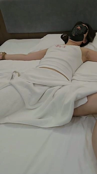【小黑】嘴里塞着袜子,胶带堵嘴蒙眼,床上大字缚,一直呜呜说话,听不懂说的啥,玩具放在最敏感地方,放置反复折磨,素人真实反应。
