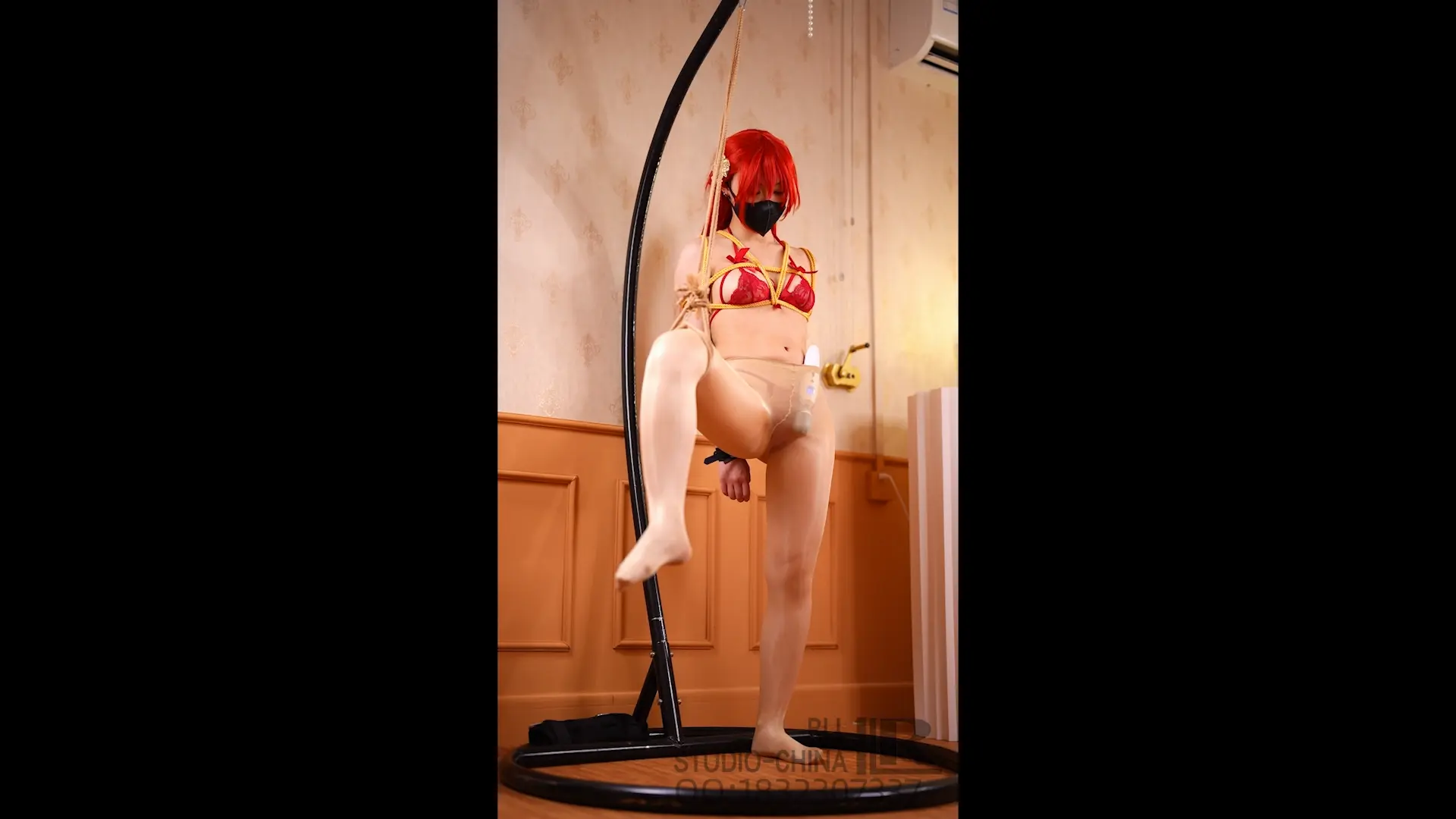 cos姬子拘束,油光丝袜和内衣,然后丝袜套头单腿吊缚