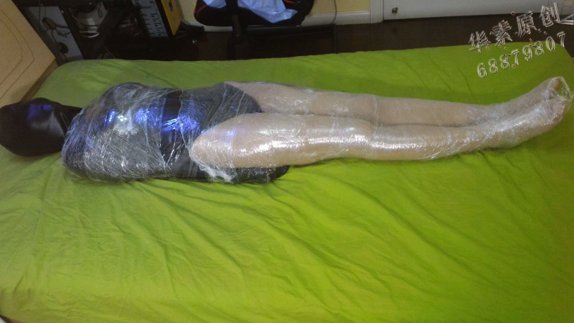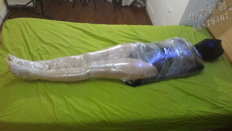 美女穿上亮舍宾裤袜,全包拘束服后,动作受到限制,然后被保鲜膜层层全包,最后头部包裹窒息受不了。