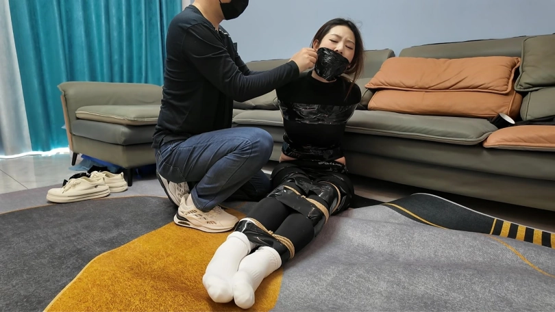 瑜伽美女茜茜在家玩手机,被入室歹徒强制捆绑,胶带堵嘴,翻完财务不算,又脱下茜想穿的耐克白袜,用茜茜自己穿的白袜硬塞到西茜嘴里,把茜茜嘴巴撑的鼓鼓的,不放心,又用胶带缠好多圈,手臂直臂捆绑,然后外面有缠上胶带,腿也是,密密麻麻,任由茜茜在地上拼命挣扎,最后还不罢休,竟然脱下自己脚上穿的白袜,捏着茜茜的鼻子,强行塞到茜茜嘴里,胶带封好,带上眼罩,扬长而去,留下茜茜在地上苦苦挣扎
