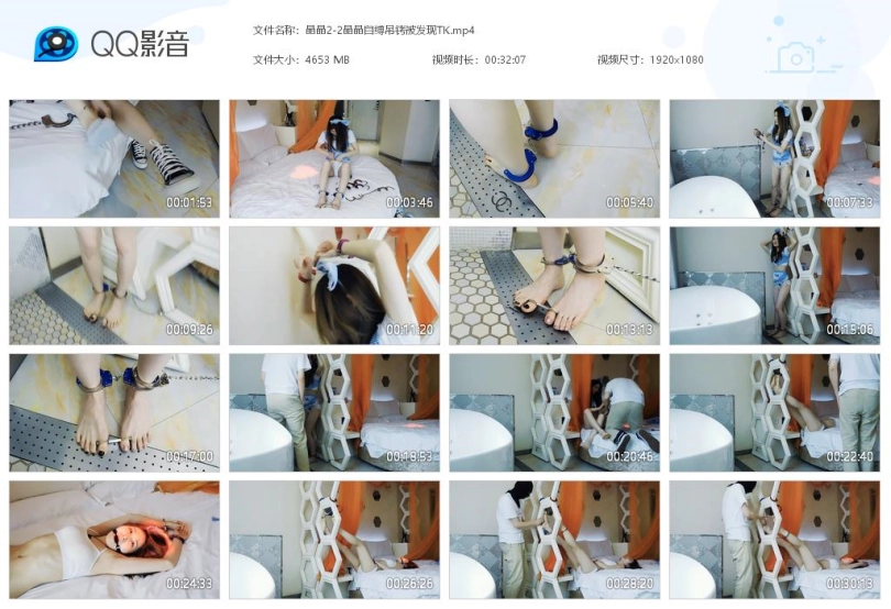 妹子一个人回家,看到了床上的镣铐,心想玩点刺激的事情,于是脱下鞋袜。锁住脚趾脚腕,塞入[不可描述],走到架子前,把一只脚拴起来,手上着钥匙,双手分别锁在栏杆上,钥匙拿在手上。妹子自己玩的很爽,扭动身体。妹子想解开手铐,结果钥匙掉在了地上。这下妹子惨了,企图用脚够钥匙,但是双脚被拴住活动范围也很小,而且还脚趾也被锁了,这下妹子可着急了,呼叫救命。男室友回来了,听到喊叫,马上前去,结果看到了此场景。问清之后,室友决定要挟妹子,让妹子以后和他一起玩,妹子无奈下只好答应,室友拿走了剩下的钥匙,并捡起地上的钥匙,放到妹子嘴里,离开。妹子十分惊恐,嘴里的钥匙看得见却拿不到,很着急。最后,坚持不住了,钥匙掉在了地上,妹子大叫并且哭泣。室友回来了,解开妹子,放在床上,把她双手锁在后面,双脚吊起来锁住,脚趾分别锁在一栏杆上,离开。妹子十分惊恐,一直求饶。室友回来了,挠妹子脚心,妹子一直扭动大笑。然后离开。妹子彻底被拴住了,非常难受,哭了。