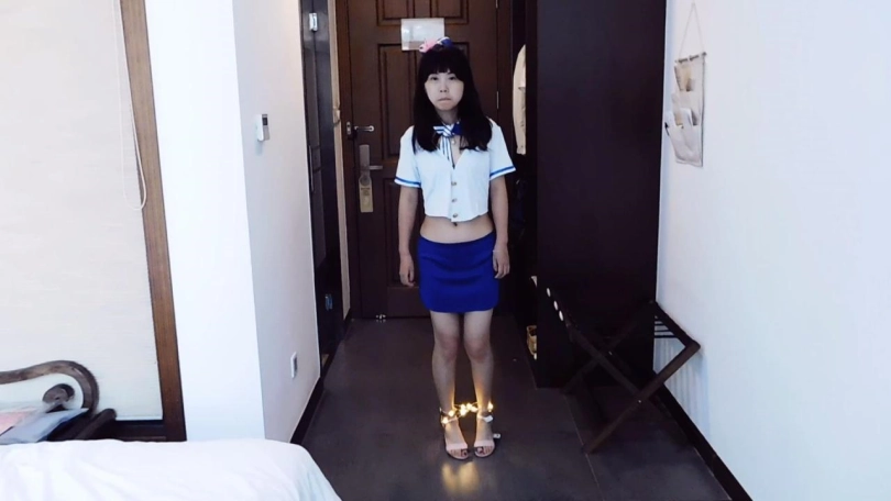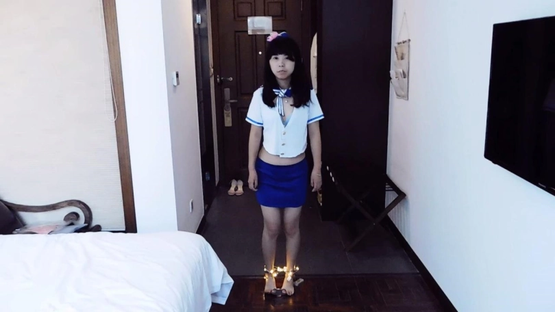 后又辩说脚扭了穿高跟鞋不方便,领班认为在找借口,强行给妹子穿上高跟鞋,戴上脚镣,离开。礼仪小姐穿着高跟鞋还戴着脚镣,走路很不方便,一边慢慢走努力适应,一边说领班坏话。这时领班又来视察,看到礼仪小姐不老实到处走,很生气。给妹子换上脚铐和链子脚趾铐,让妹子老实呆着,然后绑上彩灯,然后离开。礼仪小姐这次被锁上了脚趾,走路更不方便了,只好慢慢走活动下。这时领班又来看看,看到礼仪小姐还不老实,更生气了。解开,脱下鞋子,给妹子换上脚铐和脚趾铐,告诉妹子今天就这么被铐着迎宾吧,然后离开。礼仪小姐觉得自己被欺负了,感到很伤心,用脚把宣传广告都弄乱了,有脚趾舒张特写。活动马上开始,领班来巡视,看到礼仪小姐把广告都弄乱了,十分生气。给妹子戴上背铐,要求她踮起脚尖,就这么迎宾。礼仪小姐觉得特别委屈,还要强忍着等着迎宾,脚趾很疼。
