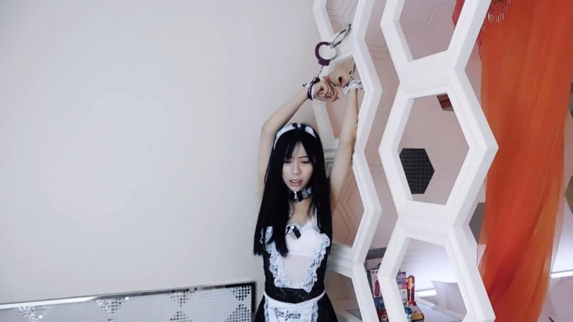 小保姆带着脚镣在家中干活,颇有微词,觉得脚镣太碍事了。保姆在打扫中,发现了一枚贵重戒指,鬼迷心窍了,偷走了自己藏了起来。主人回来了,看见妹子不好好工作,现实教训一翻。然后发现桌子上的戒指不见了,询问保姆,最终在她身上发现了。主人决定给她一些惩罚,脱下鞋袜,锁上脚铐、脚趾铐,塞入[手动滑稽]。主人要小保姆自己走到架子前,双手吊起铐上。保姆很难受,双脚只有脚尖点地,还被锁住了脚趾,一直求饶,很疼。主人还是很生气,解开保姆双手,抱到床上,驷马铐起来,戴上口球。保姆很难受,一直求饶,[手动滑稽]也不舒服。主人给小保姆解开,让她跪在床上,铐起来。保姆特别难受,一直求饶,也说不出话了,很后悔自己的行为。