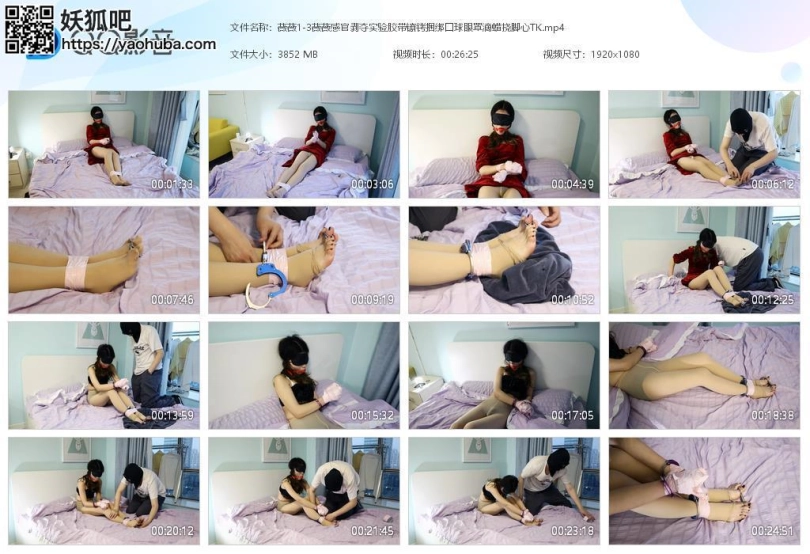 感官剥夺试验嘛,口球眼罩那是必须的,TD也戴上,ru夹也夹上,四肢用胶带镣铐捆绑起来,动也动不了,话也说不出来,眼睛也看不到,连双手手指都绑了起来,触觉也剥夺,剩下就是好好玩耍了,滴蜡,挠脚,不知道这小妞啥感觉哈哈哈!!!