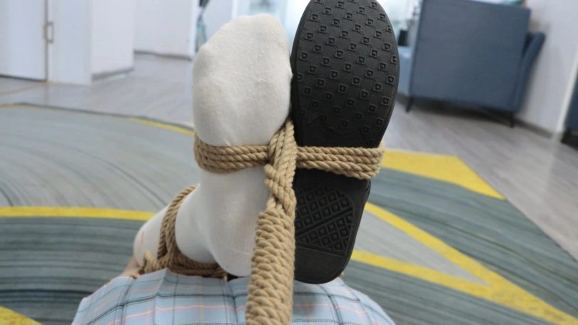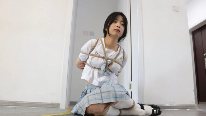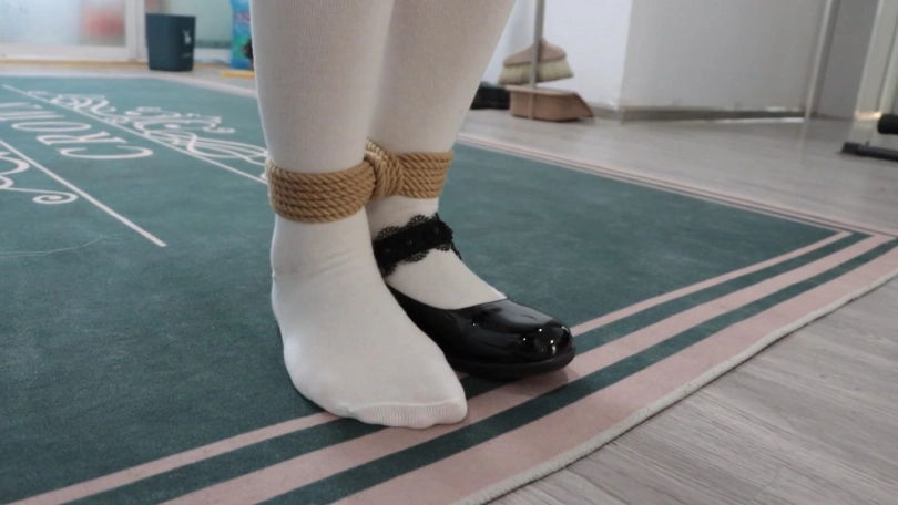 (工作人员带着琪娜来到房间里,将琪娜双手日式绑在身后,双腿并拢,将小腿、大腿多绑几圈并在中间收紧,随后关上所有房间的门,在房间比较远的几个房间角落分别放3捆绳子,在起点处地上放一只鞋子)