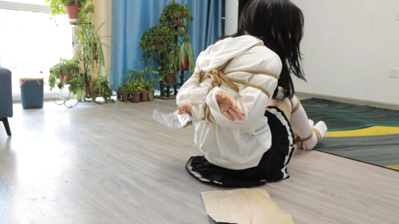 ——绮娜:嘿嘿,妹妹想被这样绑着试着打扫卫生。待会儿哥哥在客厅里到处扔垃圾,然后放一个垃圾桶,妹妹要把垃圾全部弄进桶里。