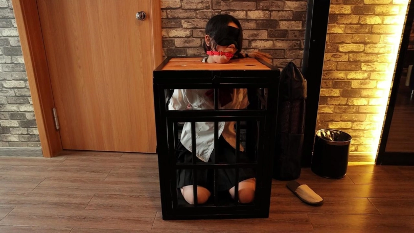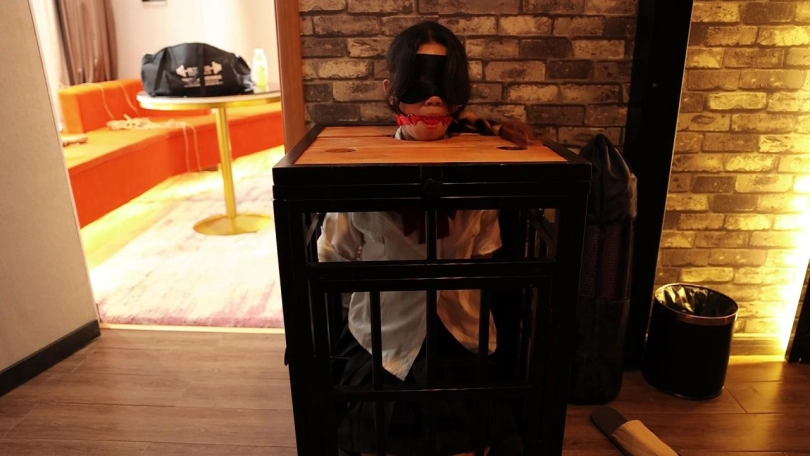 这是在SM主题酒店的第二弹,我再去之前卖了几个道具发到附近的菜鸟驿站,所以就去取快递了。但是当然又不希望CC这么轻松的躺在大床上享受空调,我却顶着大太阳呀。所以就把她双手反绑装载了一个小小的囚笼里面,里面空间超级小,CC跪坐在里面只能把全身重量全压在腿上蜷成一团才能勉强放进去,在面上用模板拘束头部,堵上嘴巴,一个完美的美人痰盂就做好了哈哈。然后我就出去取快递去了,房间里空无一人,CC再难受也只能无助挣扎,最后几分钟已经可以很明显看出CC已经坚持不住了。