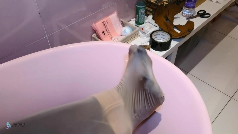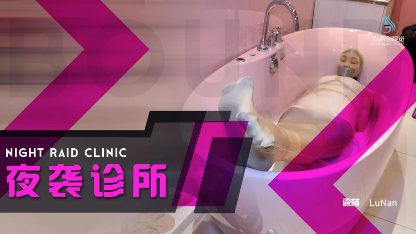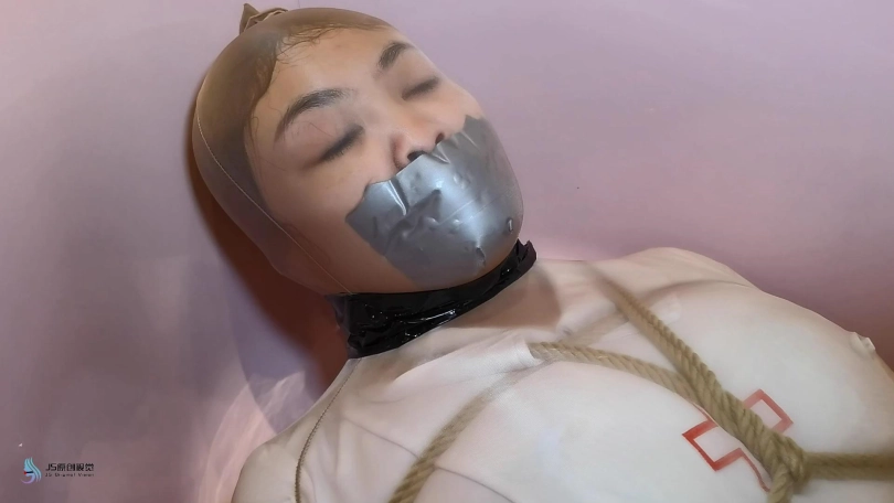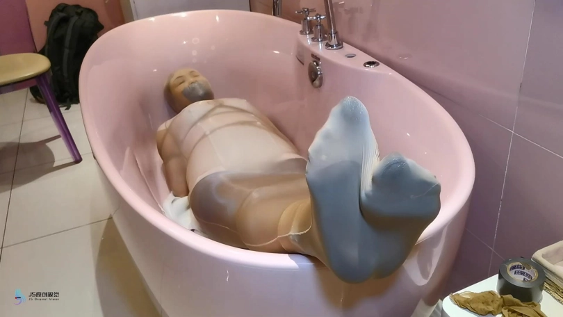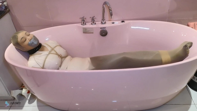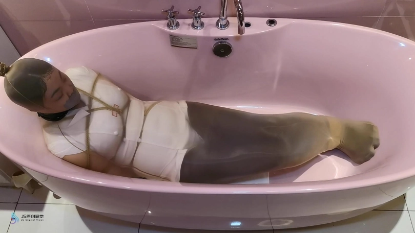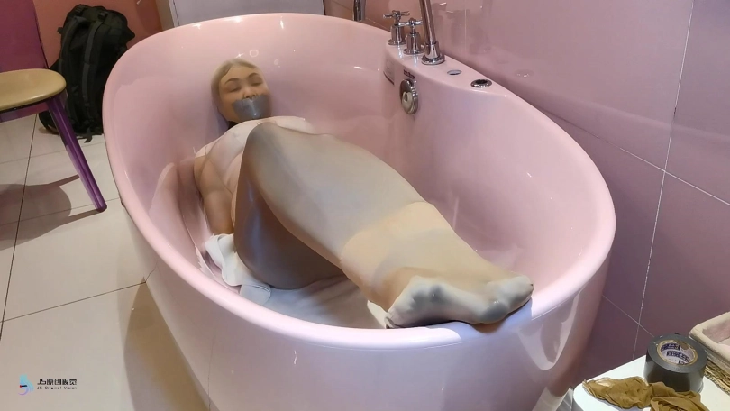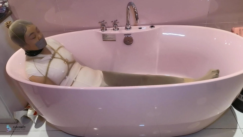 过了一段时间,劫匪将她从桌子上放了下来,并将露楠重新捆绑起来。将她套在一条很大的丝袜里面,将她放在浴缸里。露楠的双脚不断的挣扎,试图撑破包裹的丝袜,但一切都是徒劳的。她就像一只被包裹住的虫子一样,在丝袜里扭动挣扎。看来露楠只能等到第二天同事上班解救她了。。。