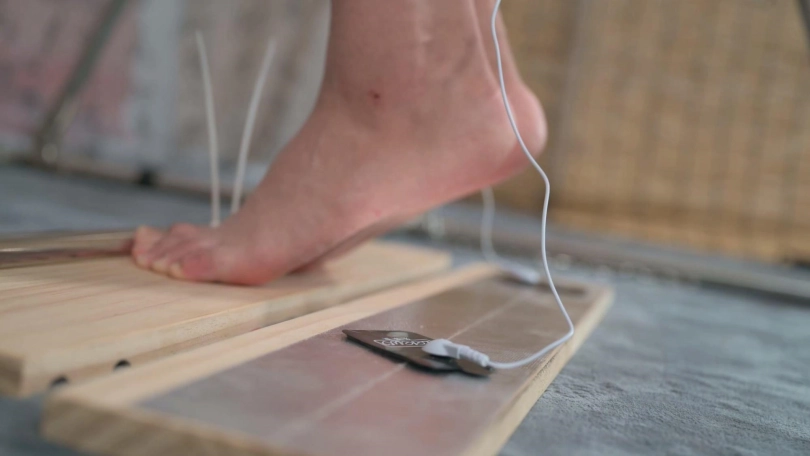 有粉丝要求发点裸足的,那就安排上。这次用扎带把妹子脚趾紧紧捆扎在木板上,木板的后半部分有导电的铝箔,把电击器的两极分别连接在腿和铝箔上,考验妹子芭蕾功力和为以后穿高跟强化练习。如果不想被电击,那只有高高踮起脚尖,如果觉着累,那就只有乖乖接受电击的洗礼。当然在中间还要加入挠痒来干扰她的应变能力,让我们看看效果如何。