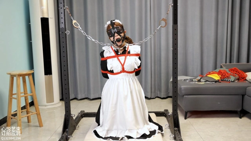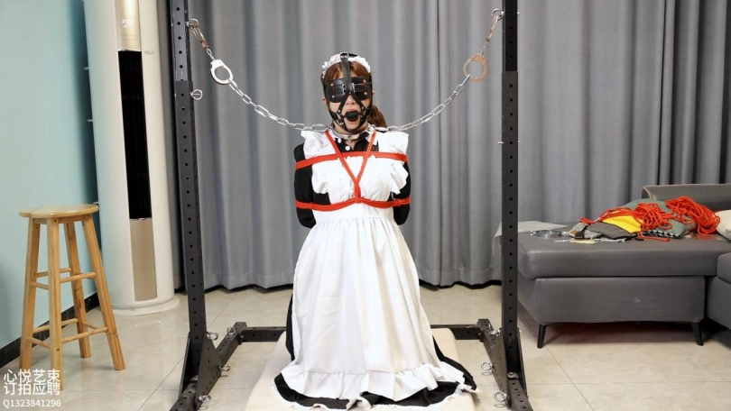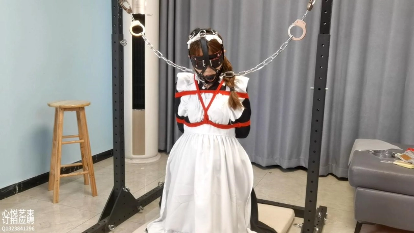 女仆的1小时超长放置惩戒。手脚被缚戴上马具口球钢铁项圈,锁在两根无情的铁架中间罚跪