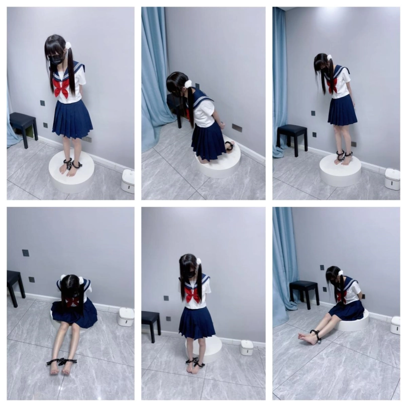 拘束完成后,开始对茶茶下达各种指令,比如罚站、罚跪、转身多角度展示、强制踮脚尖保持一定时间、带镣铐行走等。