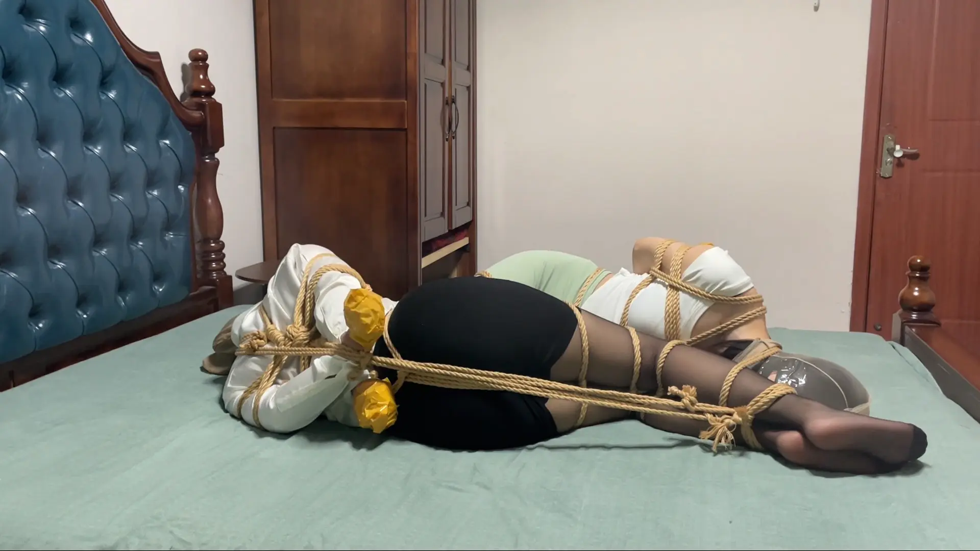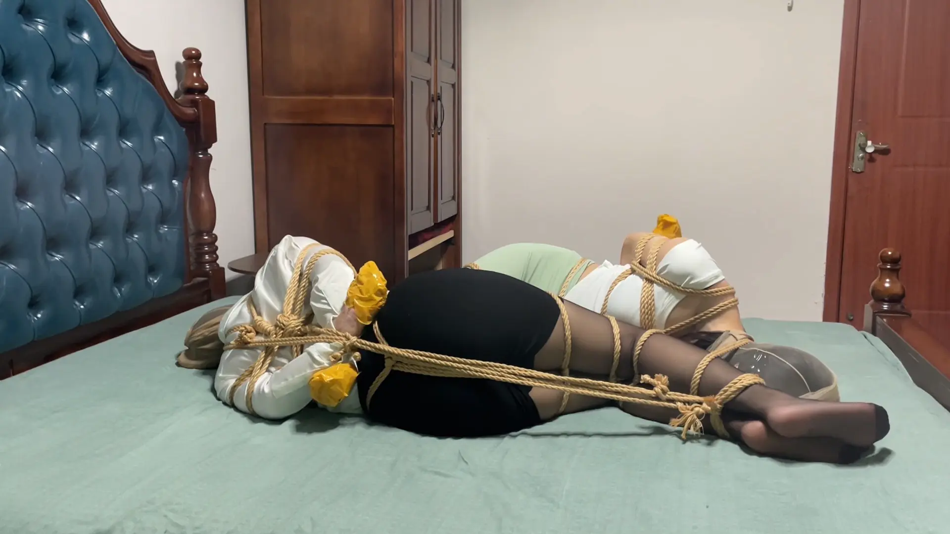最后一步,张先生把两个被捆的肉货进行头脚连缚放置,这种绑法杀伤性不强但侮辱性极大,柳洋和李然的丝袜穿了两天,已经有了一些味道,头脚连缚使得两人不得不和对方的玉足进行“亲密接触”,虽然丝袜套头过滤了一些气味,但每次呼吸仍能感受到一丝酸臭味。