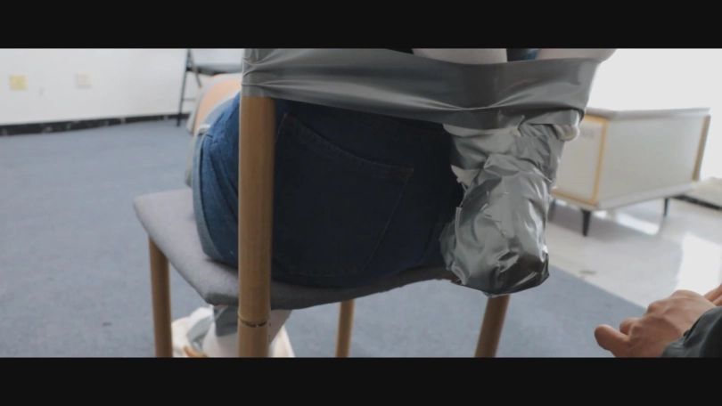 调教方式:扎带+胶带椅子缚放置,感官剥夺