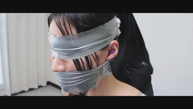 用银色胶带对刚才扎带绑的地方进行二次加固,按胶带固定好之后,老哥用胶带封住她的眼睛和嘴,拿出耳塞塞入耳朵后也用胶带加固。配音:大家请看,我不仅被扎带和胶带层层束缚,而且我的眼睛被蒙上、耳朵被塞住,嘴更不用说早就被自己亲手用臭丝袜塞满了,你们知道这是一种什么状态吗?是的没错,就是五感被剥夺的状态,双眼无法看见任何东西,耳朵无法听见任何声音,也说不出任何一个字节,身体还被牢牢的拘束在椅子上,这!就是此时此刻的我的状态!在这个特别节目播放的时间段内,我都会以这种被极限拘束的形式与大家一同观看自己的调教过程,当然,我既看不见也听不到就是了~今天我将结束为期1个月的纠正刑期,被刑满释放,请大家以我为戒,不要向我学习哦。