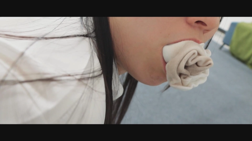 首先203登场脱掉脚上的肉色连裤丝袜,拿着脱掉的美肤袜塞进嘴里,203在努力堵嘴的时候,配音开始播放:各位观众大家好,有没有想念我啊?我是大家最喜欢的特别栏目的参与者203,相信大家都很疑惑,为什么203我刚一出场就要脱掉自己的丝袜塞进嘴里呢?其实现在给大家播放的就是203播报节目期间需要保持的状态啦~也就是此刻的我的状态,当然配音是后期啦,因为在完成为期一个月的纠正之后203就已经爱上了被堵嘴的感觉,嘴里如果不塞上自己的袜子的话就不知所措呢。