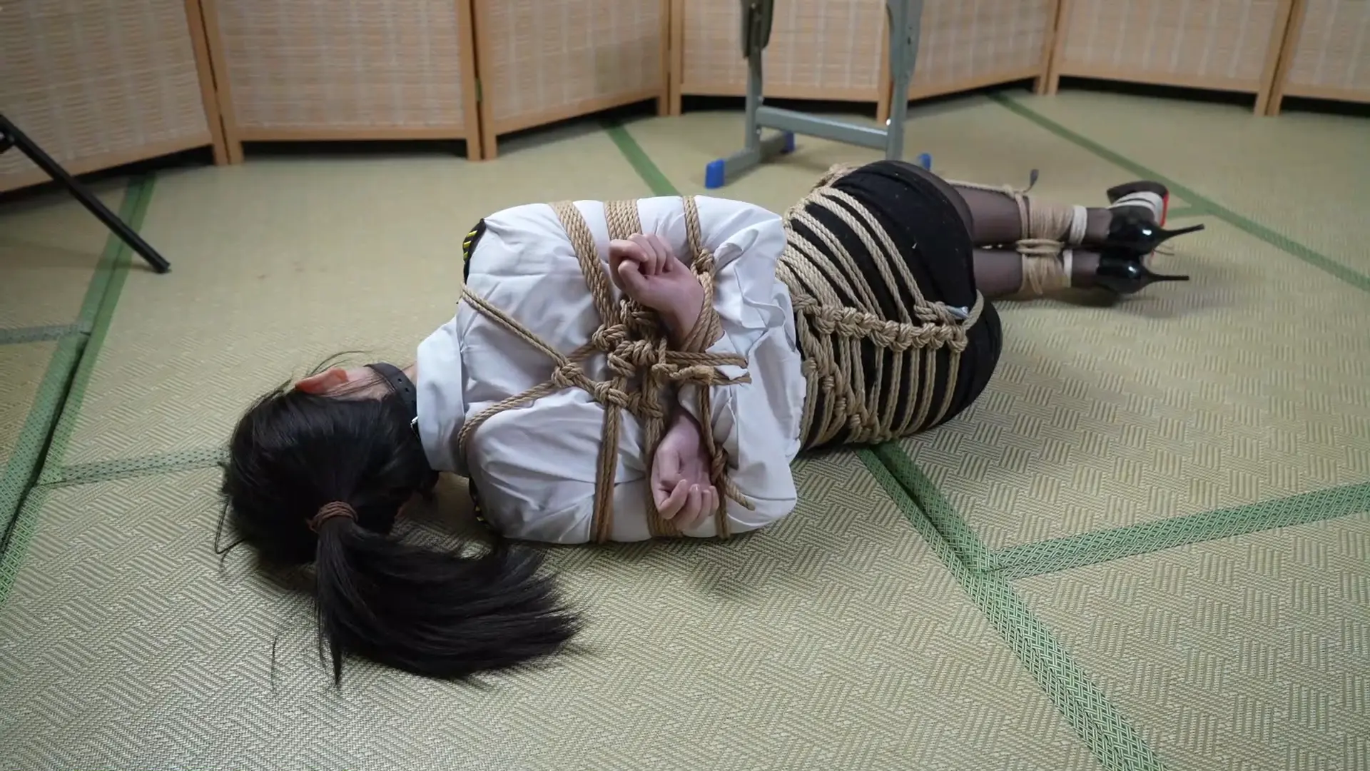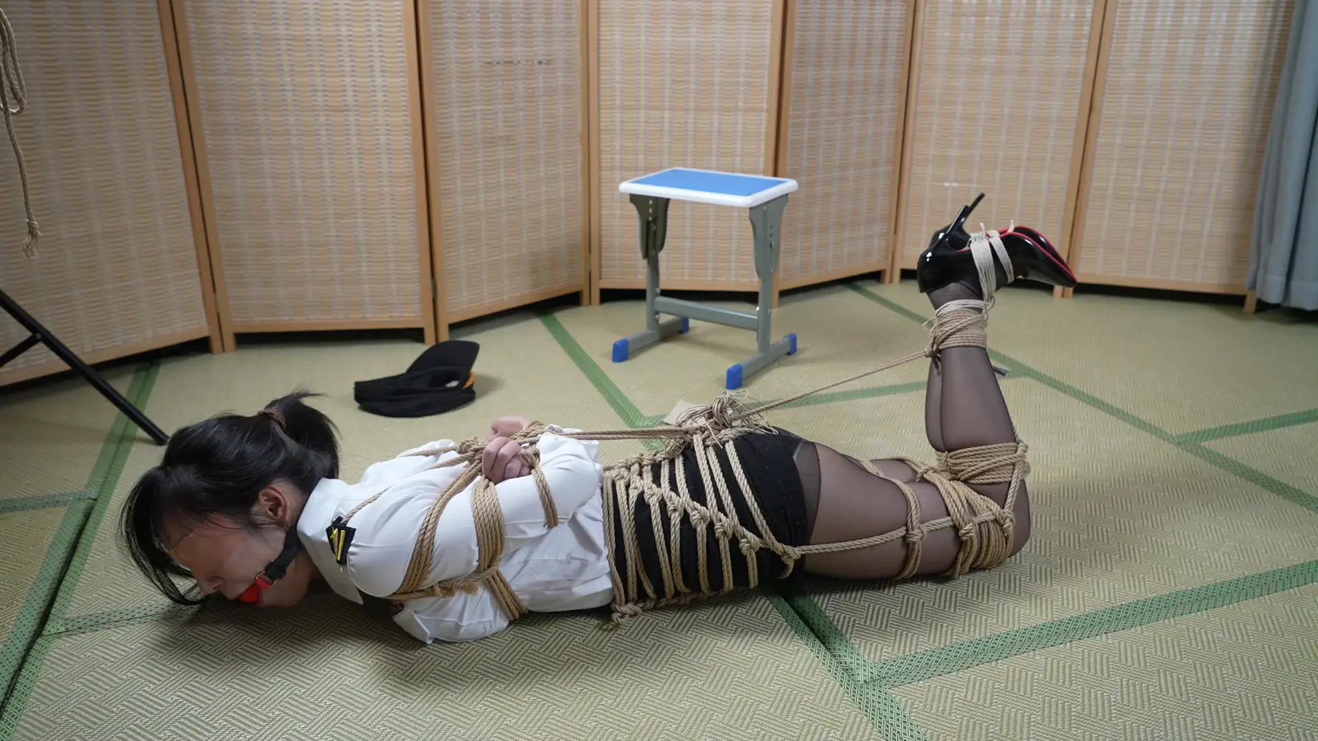 结果这种程度最后还能挣开我是真没想到,内心暴击...感觉今年最菜捆工看来是非我莫属了。接下来传统艺能编个小故事就当下酒菜微剧情了:女搜查官今天受上级指示练习如何在被缚的情况下进行脱缚反击,于是身穿制服的女搜查官便在工作场所内被同事给牢牢捆住,双脚并腿并且高跟鞋也跟着黑丝玉足给捆绑在了一起,紧接着便是脚腕和膝盖上下也被紧紧捆缚,接着便是大腿,而她的腰腹也被做了束腰,并且最后还被紧密的联系到了一起,这导致她的香足无法分离分毫。而她的双手也在背后被绑成了一个x型,这更让她的束缚变得牢不可破,而嘴巴也被口球封死导致她无法进行有效的交流,捆缚完毕后同事便离开了现场只留下女主一人无助挣扎......然而令人意想不到的是......