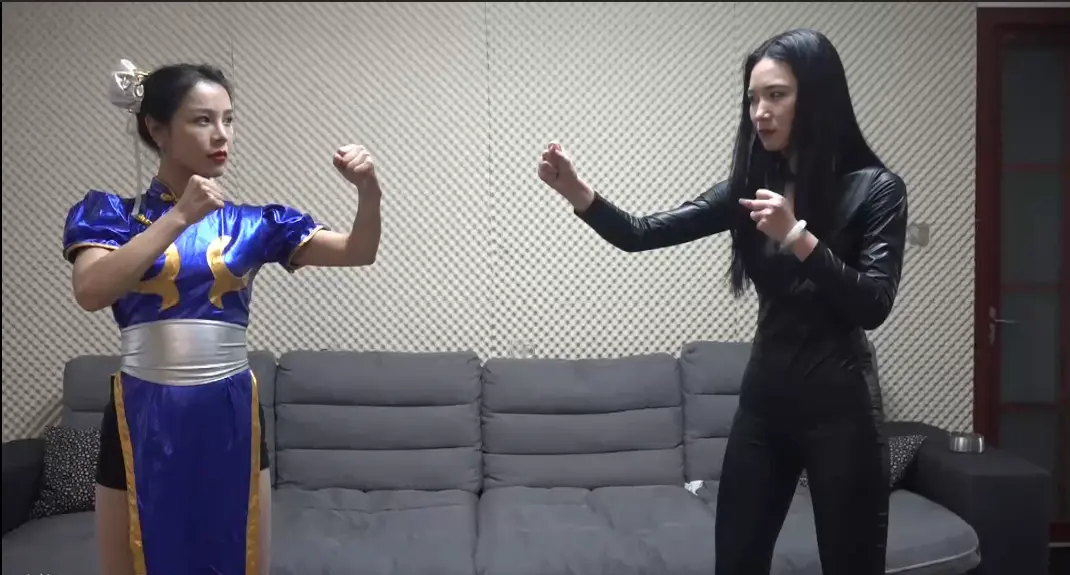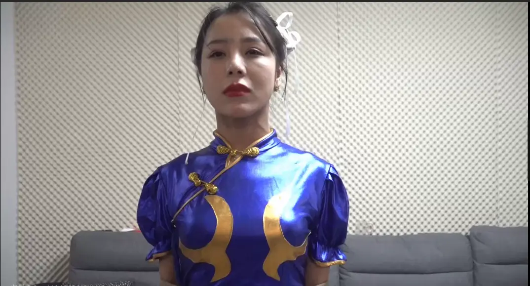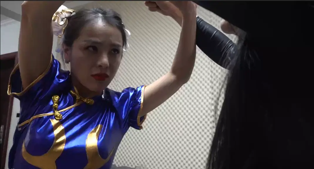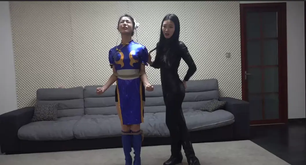 春丽女英雄为拯救与邪恶女反派搏斗,不敌女反派后被骑在身下,强制ryona,最后被魔法绳站绑,越嘞越紧。