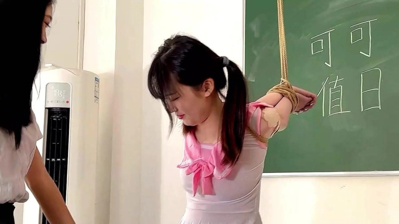可可老师的身体柔韧性极高被学生反手带上手铐吊挂,双脚张开戴上脚镣,嘴里塞入嘴环,身体前倾头无法抬起,身体弯成90度,口水不停的从可可老师的嘴里流出,学生无比的可恶,用震动机攻击老师的身体,可可老师从来没有感受过这样攻击,老师身体太敏感了不停地大声呼叫,但就是听清她在说什么,身体想躲避,但是逃不开学生的攻击。如此肤白貌美的老师,被学生这样的玩弄。真是又气又兴奋。对着屏幕就是一发。