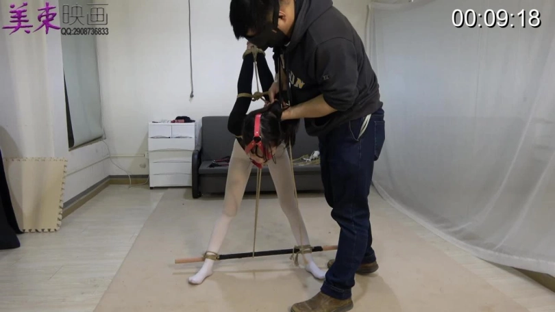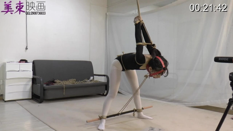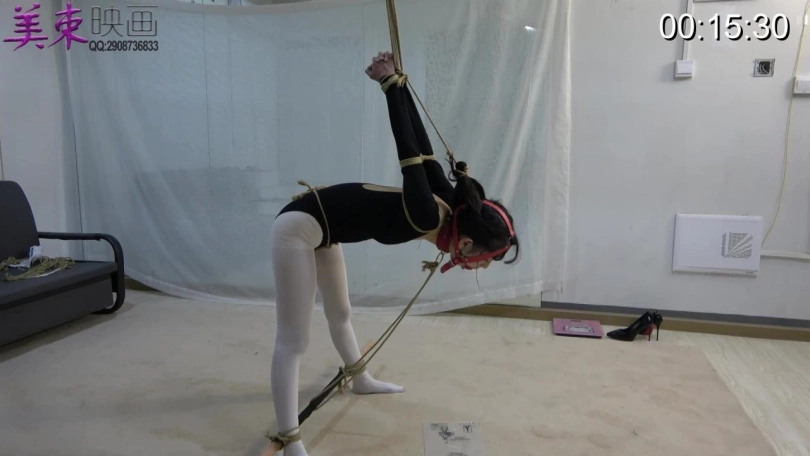 珊珊后手直臂吊缚,头发被向上拉而脖子被绳子向下拉,看似好像不是很难,只有被绑的人才知道有多辛苦。珊珊的耐力真的不错,这么难受的姿势可以坚持20分钟。