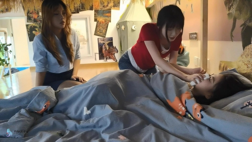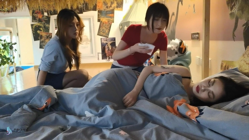 女二慢慢的走到女一的床前把刚才的那张纸巾慢慢的放在女一的鼻子上然后站了起来,女一问到了一股刺鼻的气味开始扭动身体,女一下意识的想用手扒开嘴上的纸巾,就在这个时候女二然后突然捂住女一,呜呜呜,女一开始反抗,女二说快摁住他,女三摁住女一的身体,女一开始剧烈的挣扎,在药物的刺激下女一开始失去了意识,慢慢的不动了,女三说女二你这是干嘛,你不怕你表姐知道吗,女二说没事的我早就看出来你对我表姐有意思了,我刚才吃饭的时候偷偷给他的水了放一种可以让人失忆的安眠药,他是不会记得的,你现在可以享受我的表姐了。