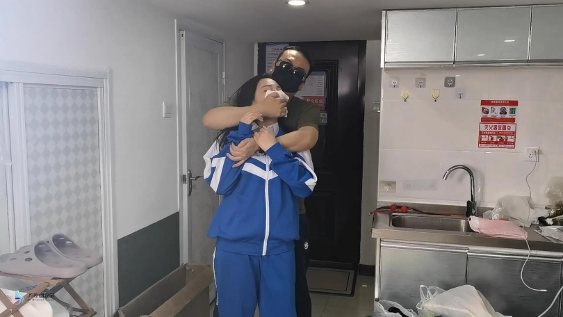女主在沙发上醒来,起身逃往门口,被尾随者发现后被迷晕(激烈挣扎和呜咽持续10-20秒),随后被公主抱抱起,对着镜头环绕展示后(15秒以上),尾随者将其公主抱进入卧室,放在置床上,脱掉女主的板鞋,露出白袜后给足部特写。尾随者将女主白袜脱下后,露出黑丝,再次给足部特写。后将白袜塞入女主口中(塞入过程全程特写)。随后脱去女主校服长裤和外套,拍摄全身游走镜头(从头到脚的展示+面部特写)。尾随者抚摸女主黑丝腿部,从下到上摸遍全身(固定镜头保证女主全身都入境),随后将女主白衬衫口子解开后脱去白衬衫,露出内穿普通短袖t恤。尾随者离开卧室,拍摄女主躺在床上的全身游走镜头。