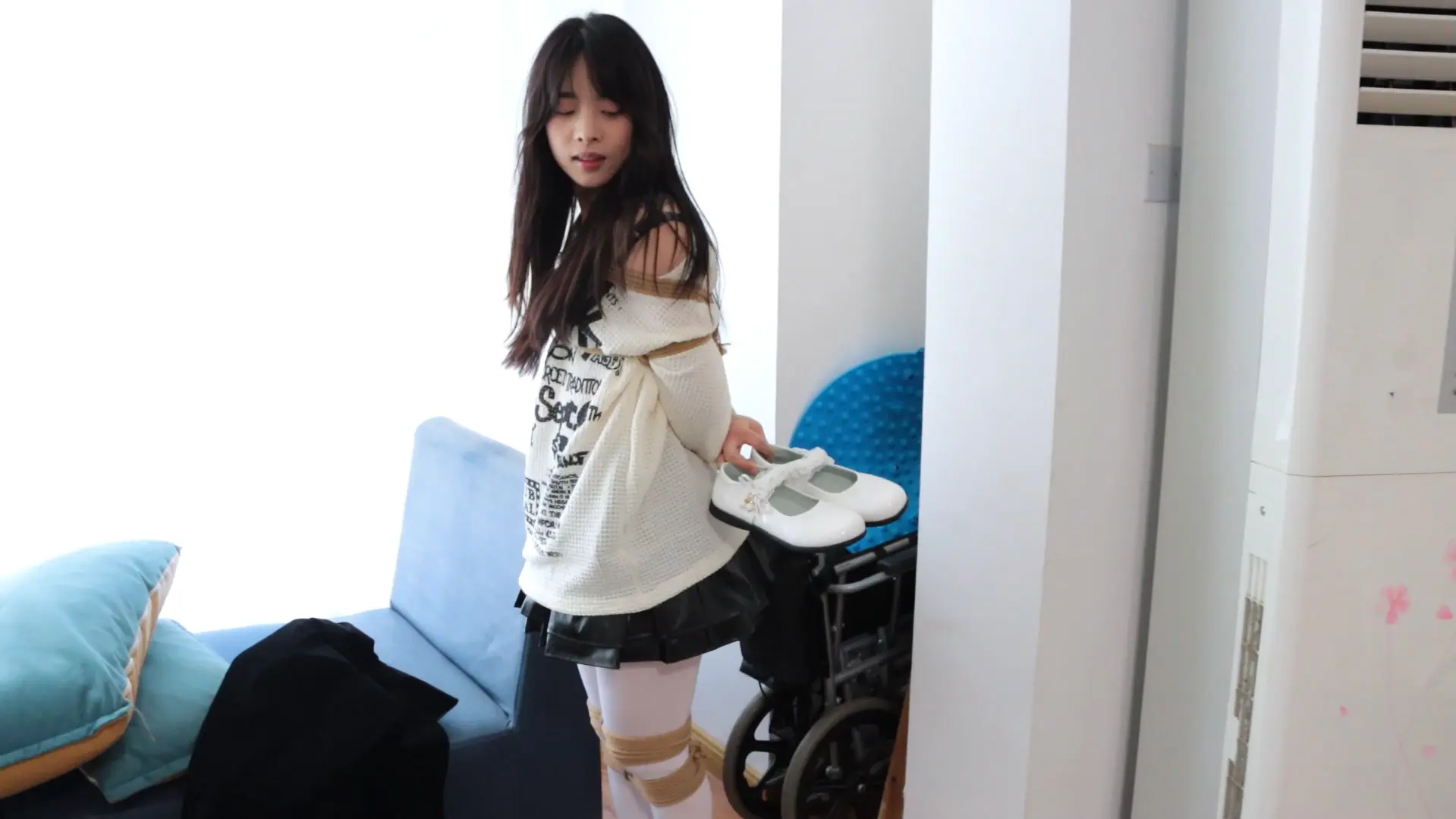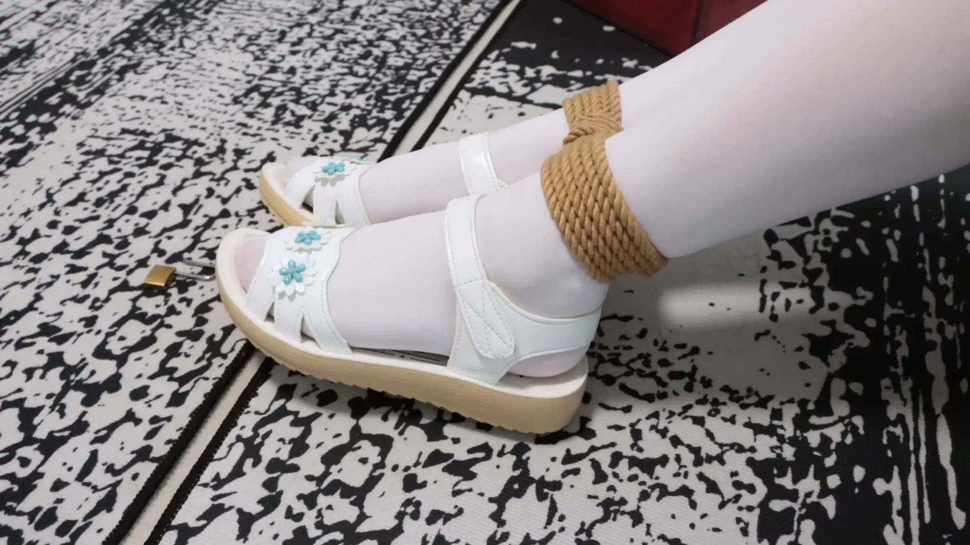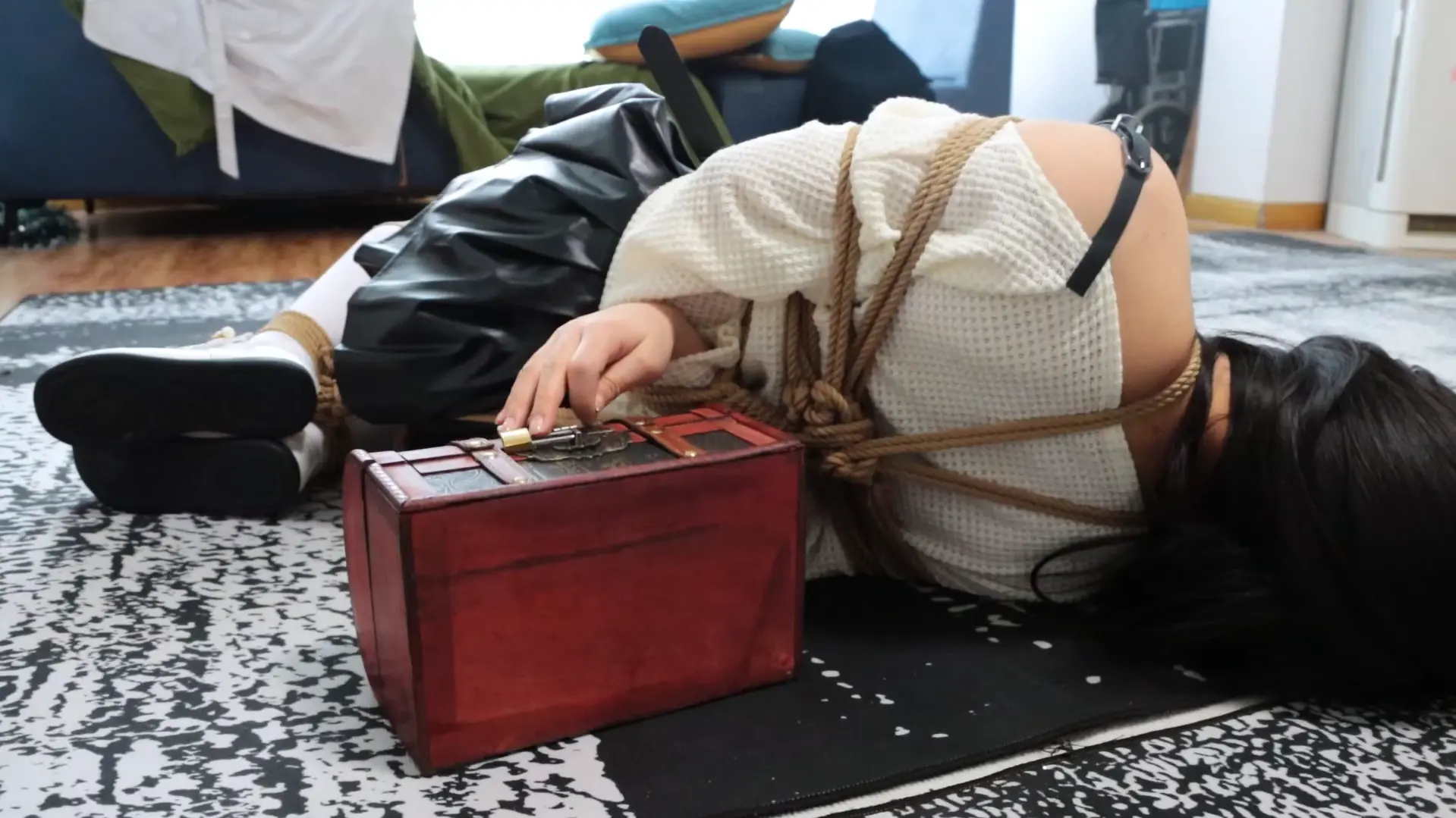 模特需要在房间内找到藏着钥匙的鞋子,每次找到一把钥匙都会换上新鞋子并增加一处拘束,用找到的钥匙试着打开一个挂着多把锁的容器,大门的钥匙就在里面,模特能否成功逃脱呢?