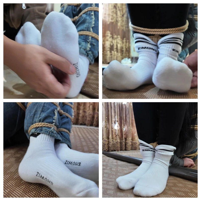 言归正传,剧情如下:绑匪一脚刹车,连坐在位置上的坏人都朝前一下,头撞到了驾驶座位,痛苦不已,当然更痛苦的是塞在后备箱的两美女,呜呜表示抗议,可两绑匪哪管美女的抗议,哪懂什么怜香惜玉呀!下车,打开后备箱,抗两美女一气呵成,简直不要太熟练。镜头一转,两绑匪扛着两美女走进了他们的老巢,将两美女扔到沙发上,然后两绑匪将两美女搂在怀里,开始讨论如何玩弄她俩,芷溪和大雷呜呜呜又屈辱又不情愿又无可奈何,被五花大绑的自己只能接受命运的安排,成为绑匪的玩物!两绑匪一番商量决定把大雷站着捆绑在柱子上,把芷溪坐着捆绑在柱子上,这样有两个好处,就是方便两绑匪玩弄两美女,而两美女除啦能扭动身子其他动弹不得。商量决定后,二绑匪先将大雷捆绑到柱子上,捆绑好她上身后,二绑匪脱去大雷的靴子,露出了白袜,然后再将她的双脚捆绑到柱子上;将大雷捆绑结实后,绑匪又将芷溪压到柱子边,让芷溪坐下后也将她结结实实地捆绑在柱子上。将两美女捆绑结束后,绑匪拿来一块厚毛巾,解开芷溪的口球后,将厚毛巾塞入她的樱桃小嘴里,也是难为芷溪了,樱桃小嘴里塞着块厚毛巾别提多难受了,可绑匪丝毫没有停下,继续在芷溪嘴上贴了五张黑胶布,彻底让她说不了话了,只能发出呜呜呜的闷哼;将芷溪捆紧堵严后,二绑匪将手伸向了大雷!对于大雷的嘴巴,当然是绷带伺候,一圈又一圈缠绕的白色绷带把大雷嘴里的棉袜深深地堵在嘴里,让大雷就算在难受也只能发出几声呜呜呜的闷哼。将二美女捆紧堵严后,两绑匪兴奋到了极致,立马合力脱了芷溪的鞋子,对着她的白袜脚,腰子疯狂TK,芷溪呜呜呜得难受挣扎,绑匪问芷溪:舒服不舒服?芷溪摇摇头呜呜呜不舒服,绑匪说到:那就继续挠,挠到舒服!芷溪又受着TK,接着绑匪又问到:舒服不舒服这回?芷溪呜呜呜道:舒服了!绑匪说到:舒服呀?舒服就再让你舒服一下!这绑匪是真的损,挠着芷溪后又问她,这回你舒服了,是不是让你姐姐也挠一挠舒服一下?芷溪呜呜呜摇头拒绝,绑匪说到:那既然你姐妹情深,就继续挠你。芷溪呜呜呜带着哭腔再次接受新一轮的挠脚心,挠腰子呜呜呜!接着,绑匪又问到:这回你爽了吧?该挠你姐姐了吧?芷溪呜呜呜含糊不清道:挠姐姐吧,我受不了了。绑匪说到:是你连累你姐姐,现在还让我们挠你姐姐,我们要教教你怎么做人!接着加大挠的力度,芷溪呜呜呜被TK得筋疲力尽只得低着头,生无可恋的发出呜呜呜的声音,玩腻了芷溪的二绑匪,又将坏念头指向大雷,又开始对大雷动手动脚还说:事情都因为你妹妹而起,要怪就怪你妹妹吧,和我们没关系。然后对着大雷的腰子,脚心疯狂TK,大雷呜呜呜挣扎,可胸部,肩膀,双手,大腿,膝盖,脚腕都被结结实实绑在柱子上的她,除了发出呜呜呜的声音外做不出任何回应。接着二绑匪觉得二人玩一女腻了,就分工,一人挠一女,好让芷溪和大雷都享受到被TK的快乐!最后玩腻的二人,决定去吃点东西,检查完二美女身上的绳索捆绑得是否紧缚和嘴里的堵塞物是否严实后,对美女进行警告,让二美女老实点后离开,留下被结实捆绑堵嘴的二女在柱子上挣扎并发出呜呜呜的声音。