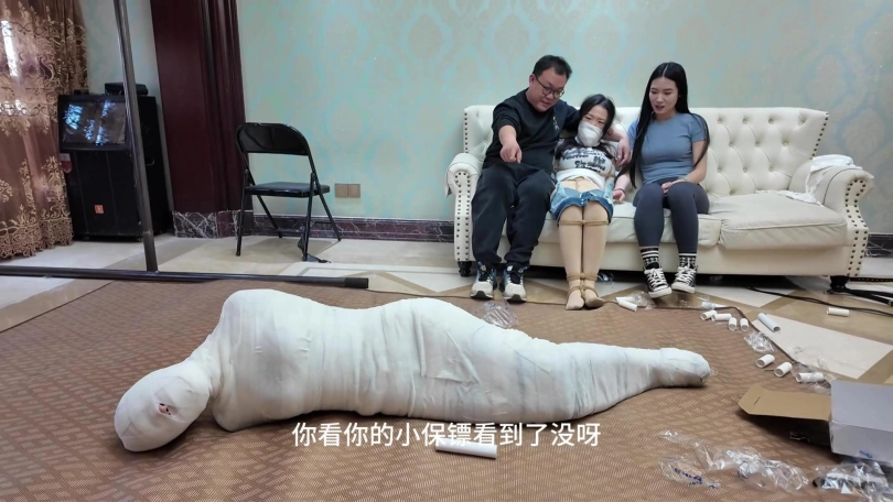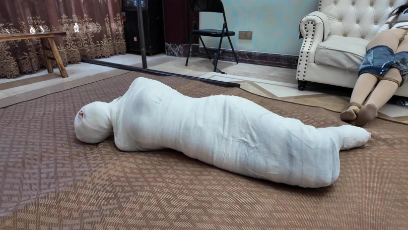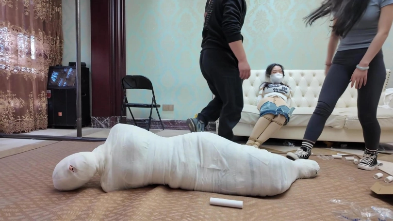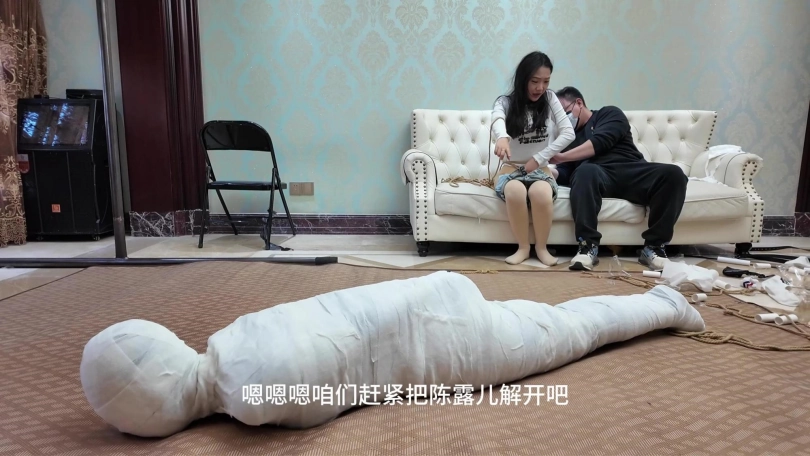 男女劫匪离开后,女保镖和佳雯继续在沙发上挣扎呻吟,由于她们两人的手掌也被包裹起来,根本做不了什么。过了一会儿,佳雯成功用脚替女保镖弄脱了两个厚重的口罩,女保镖的呜呜声也变回大声了一点,不但如此,女保镖的手机从袋中掉在地上,两人不断尝试用脚趾拨弄手机号码。由于两人的丝袜脚太过顺滑,她们花了很多久仍未能成功拨打号码。此时男女劫匪突然想起回到家中拿回工具,正好看到她们两人不老实用脚趾拨弄电话,于是过去把电话没收了之如,决定对她们两人施加额外惩罚。男女劫匪先互相蹂躏女保镳和佳雯有人的身躯,两位美女在多重的捆绑之下只能任由男女劫匪鱼肉。此时,女劫匪想起一个点子,为了带走更少的捆绑道具,她突然想起一个乐趣味的点子,就是把所有绷带用在女保镳的身上,把她包成木乃伊,女劫匪想试试把女保镳包成木乃伊后,她还有没有能耐挣扎逃脱。男女劫匪开始互相配合,不断用绷带往女保镳的身上缠绕,直到从头至到脚趾,没有留下一点空隙,而在沙发上挣扎的佳雯只能白白看着自己的女保镳变成一具完美的木乃伊在地上挣扎。男女劫匪临离开前也不忘玩弄佳雯的股绳,直到她忍不住[X_X]。男女劫匪之后离开家中,任由那两女在屋内挣扎。佳雯的爸爸晚上回到家中,看见自己的女儿和女保镳被拘束着,最终救下了她们。